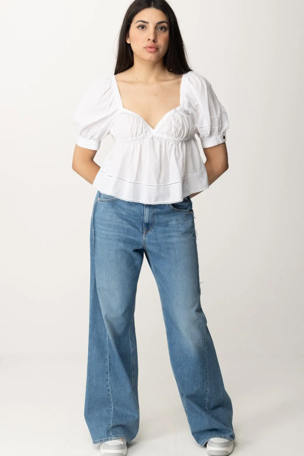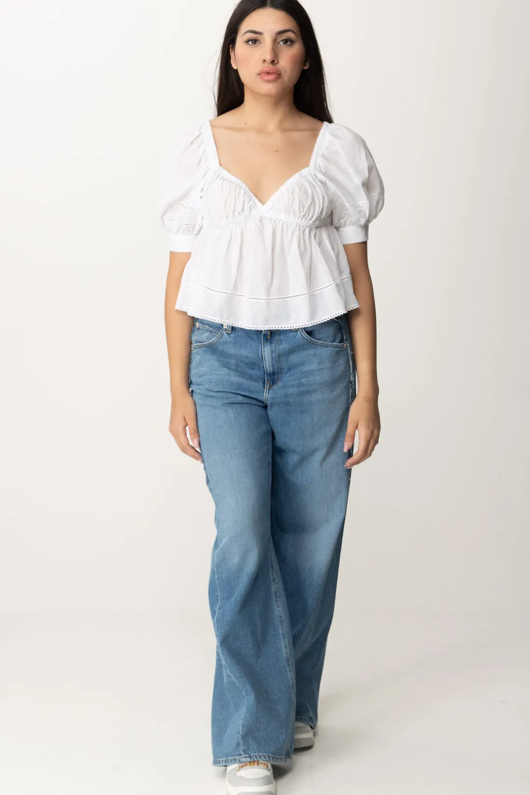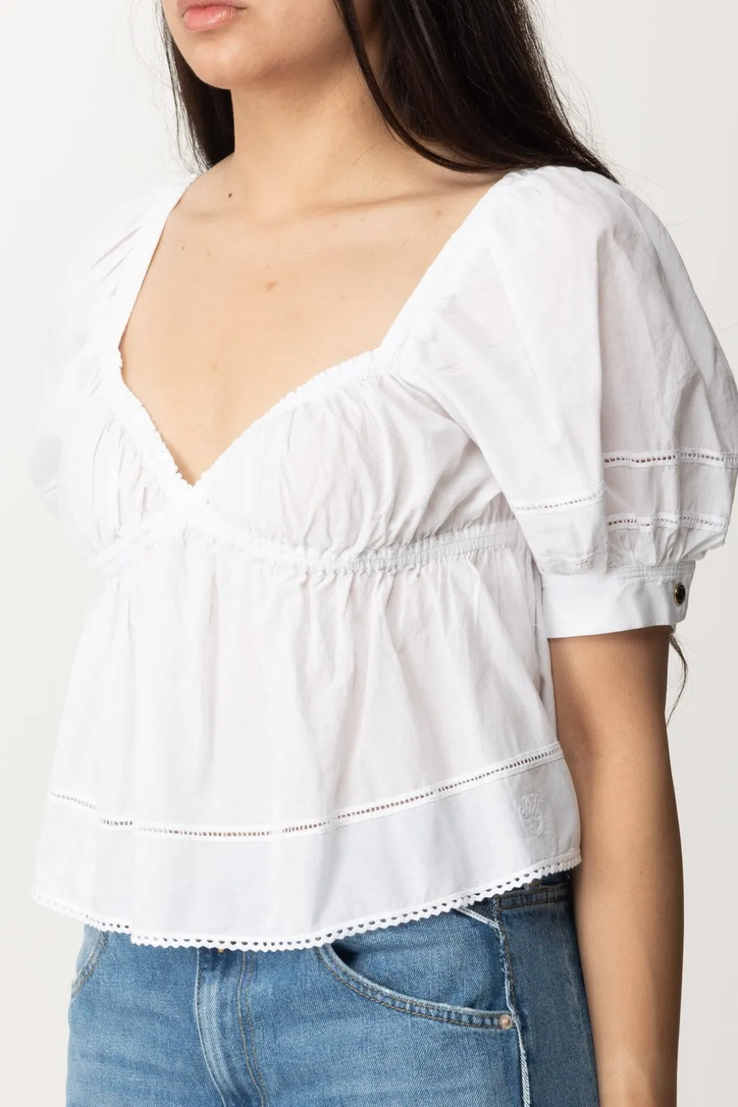 L’estate chiama bianco, tessuti freschi e, soprattutto, sfiziosi design e ricami: e allora questo top Pinko in mussola di cotone è la perfetta risposta a questo richiamo! Maniche a palloncino e scollatura strutturata sul seno, svasato lungo i fianchi e candido come la luna: sarà bellissimo da indossare su bottom colorati o sul classico denim, portando in giro con te la quintessenza dell’estate.