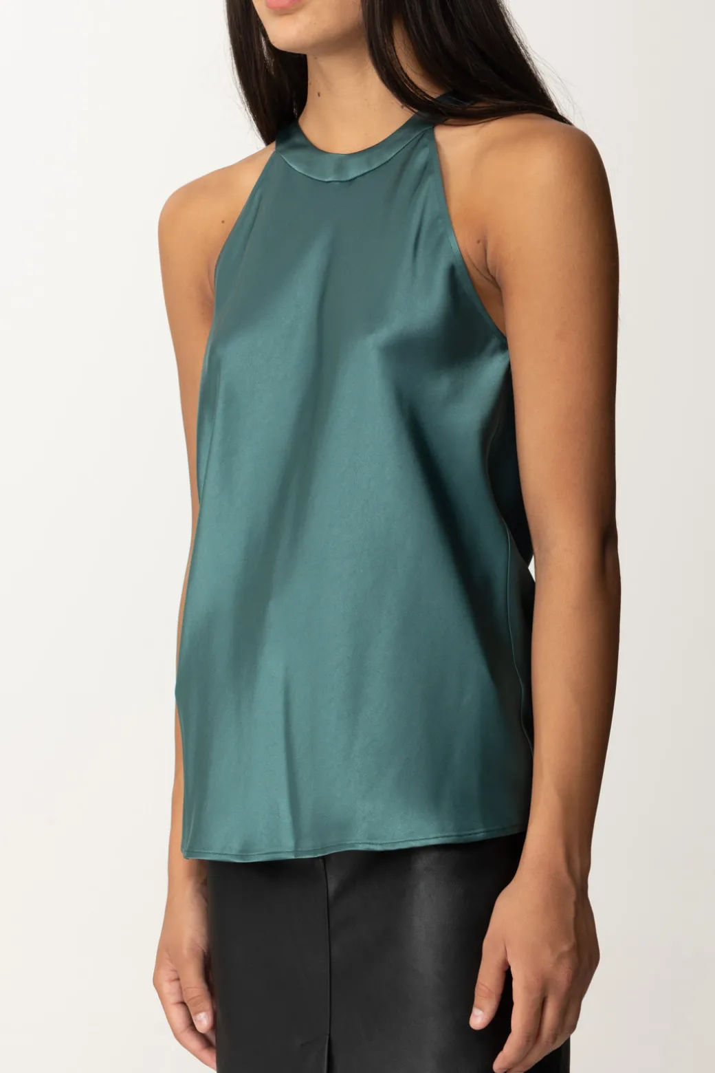 Top Pinko estremamente chic, realizzato in luminoso satin che potrebbe già esser sufficiente a darle l’allure elegante che lo caratteriza. Smanicato, lo scollo all’americana si conclude con un fiocco sul retro, dove un inserto in georgette crea un ampio scollo a goccia. Ideale per look anche da cerimonia, combinato ad un bottom che gli sia pari in femminilità.