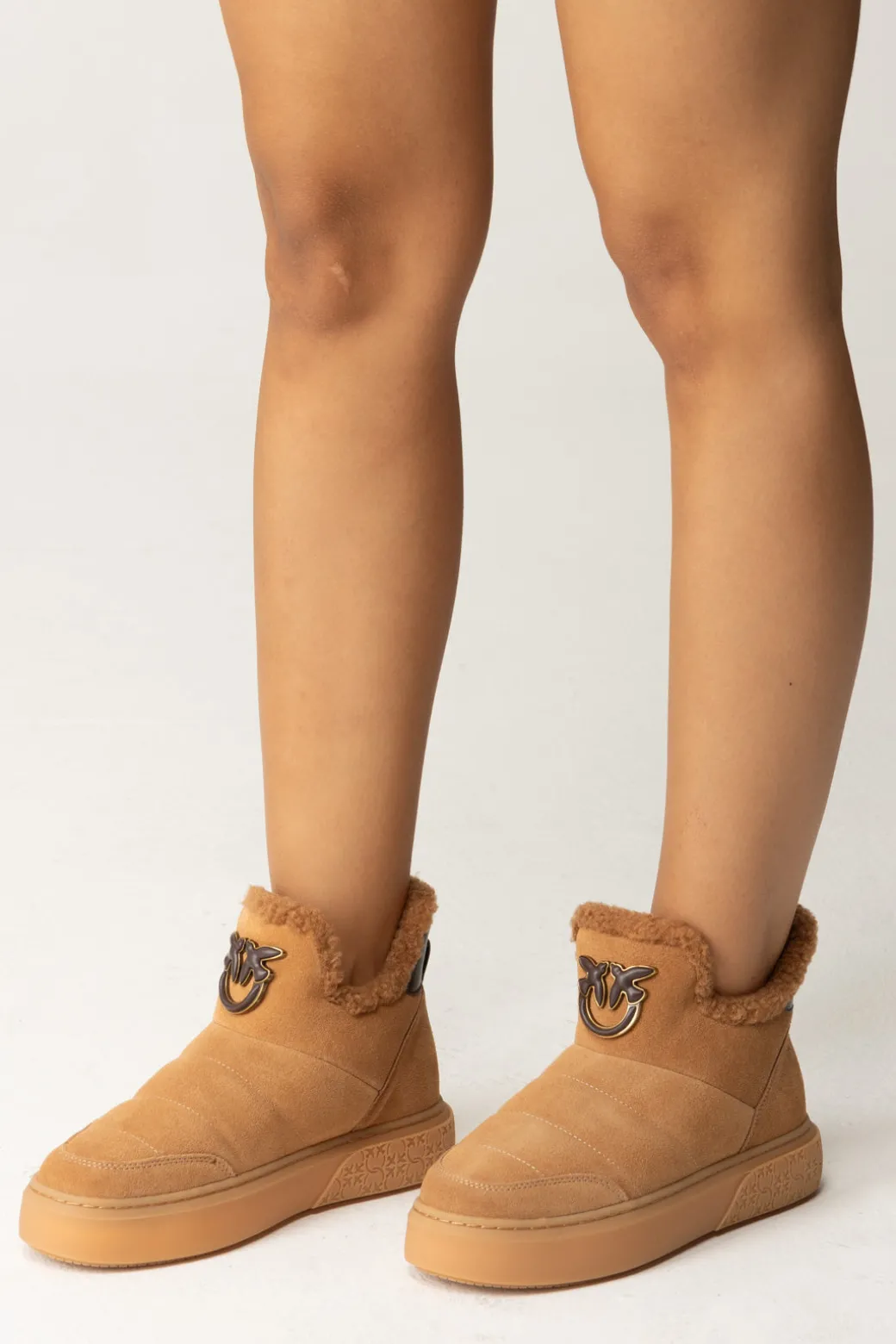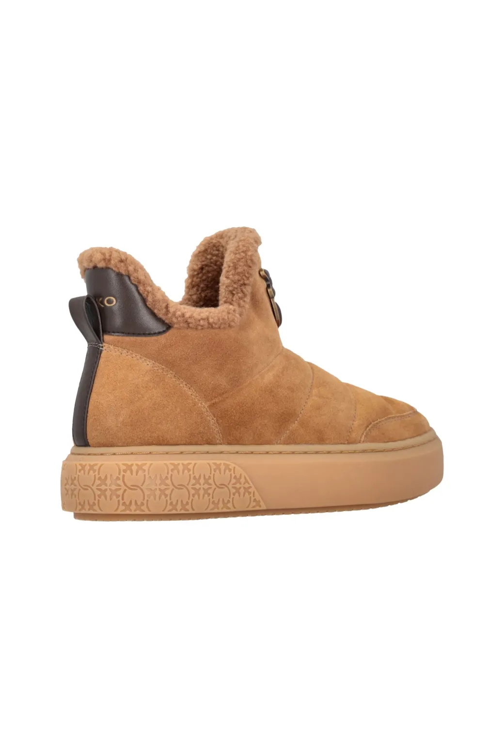 Se il cozy si potesse esprimere con delle calzature, questi stivaletti Pinko entrerebbero perfettametne nella ompetizione! con pelliccetta e rivestiti in pelle scamosciata, il platform in gomma è arricchito sul retro da un pattern a logo monogram, ripetuto sul fronte in forma di placchetta Love birds. Per le tue giornate più fredde, per i tuoi outfit più originali!