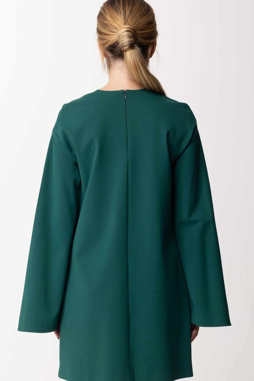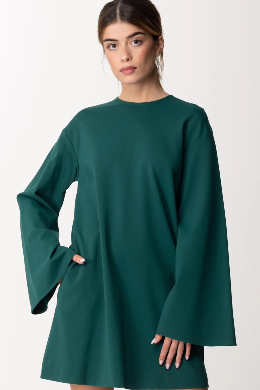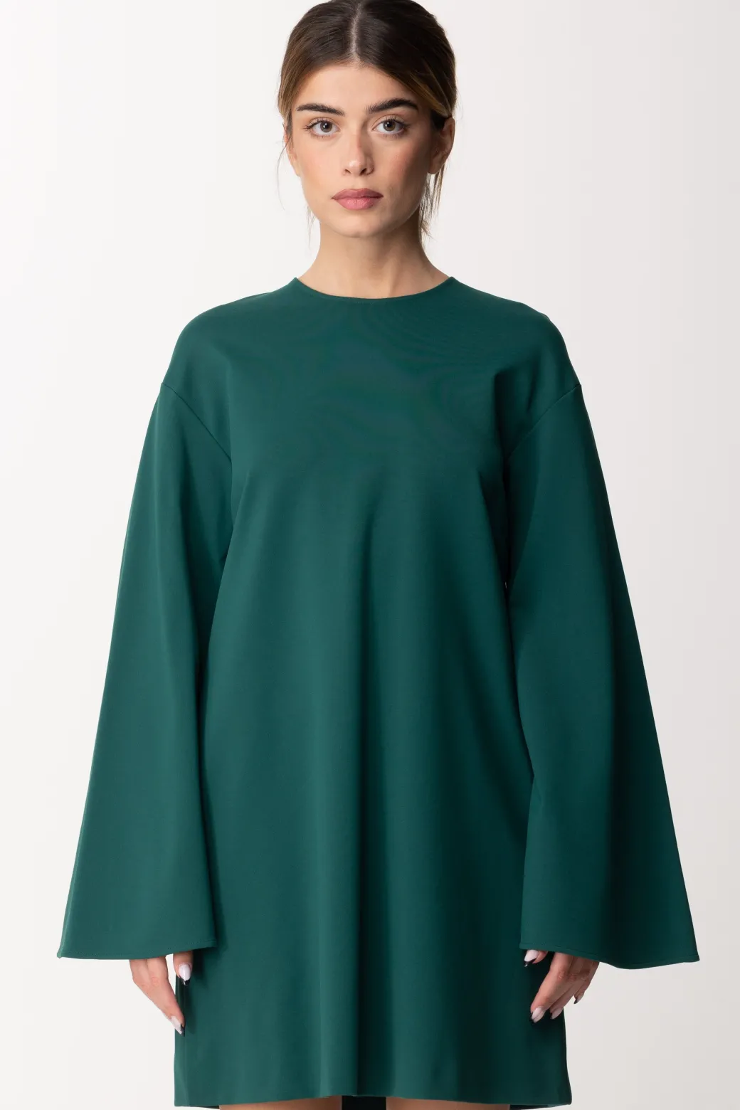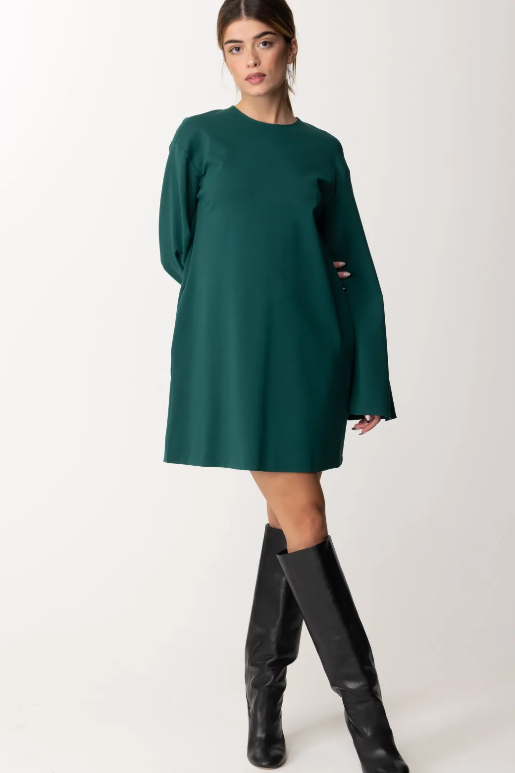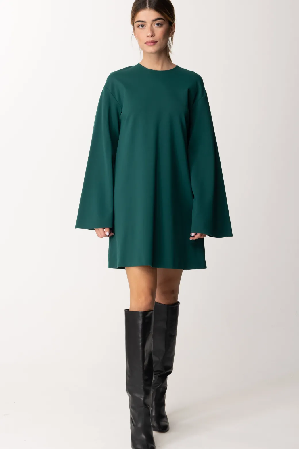 Questo mini abito dal taglio ad A, presenta delle maniche a campana, uno scollo girocollo e una vestibilità morbida anche sul punto vita. Perfetto per un’uscita pomeridiana con stivali sopra il ginocchio, e perfetto per la sera se abbinato a décolleté nere, per un look glamour e super raffinato.
