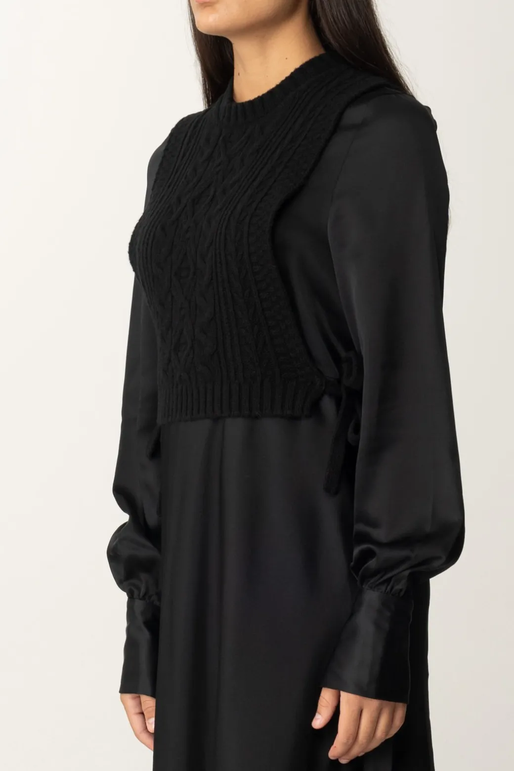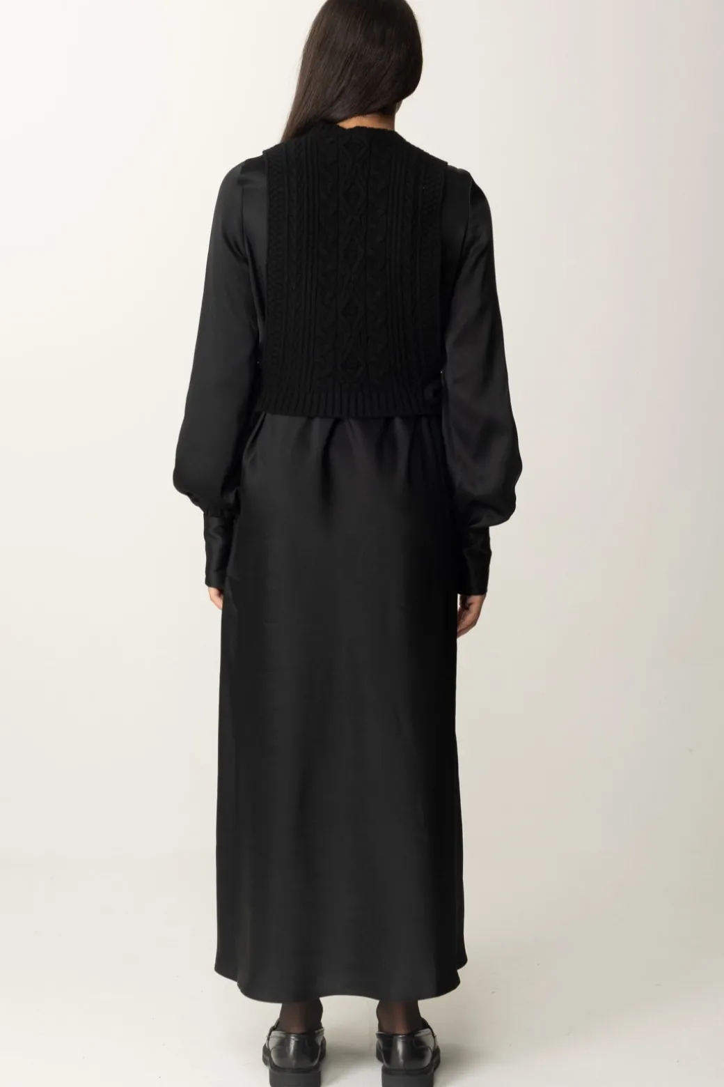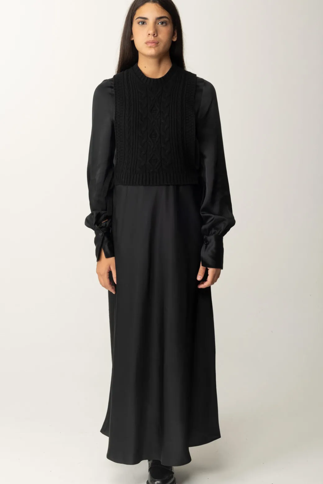 Questo abito Semicouture in envers satin è elegante e minimalista, le maniche sono leggermente ampie sui polsi, creando un effetto fluido e morbido. Sopra l’abito, un gilet lavorato a maglia aggiunge texture e un tocco casual al look. Da indossare con mocassini per un look comodo o con sandali per aggiungere un twist di eleganza sobria.