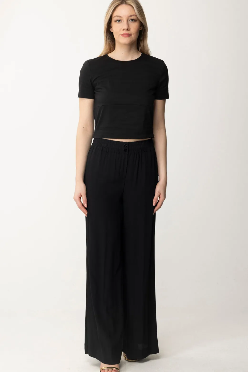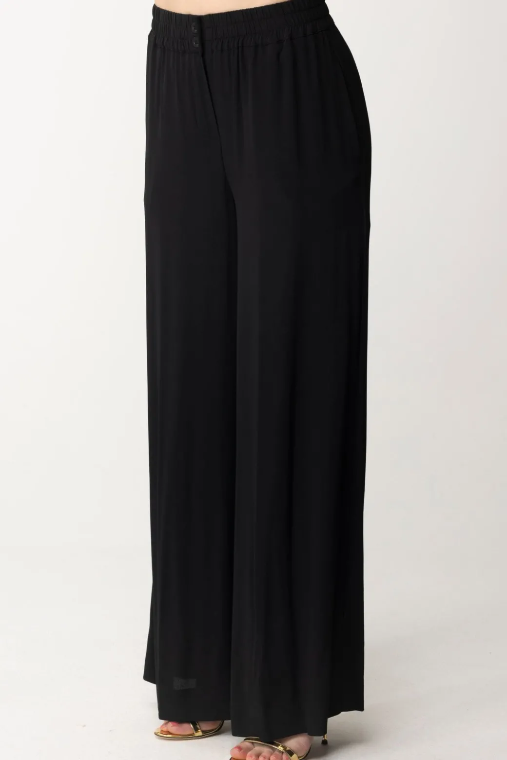 Pantaloni palazzo Semicouture a metà strada tra l’elegante e il casual, e pertanto versatili al punto giusto per i tuoi outfit di stagione. Gamba ampia e fluida, realizzato in crepe de chine, il punto vita è elasticizzato, corredato da chiusura con bottoni in madreperla: un perfetto equilibrio, sposato alla tina nera, per poterli indossare quando e come vuoi.