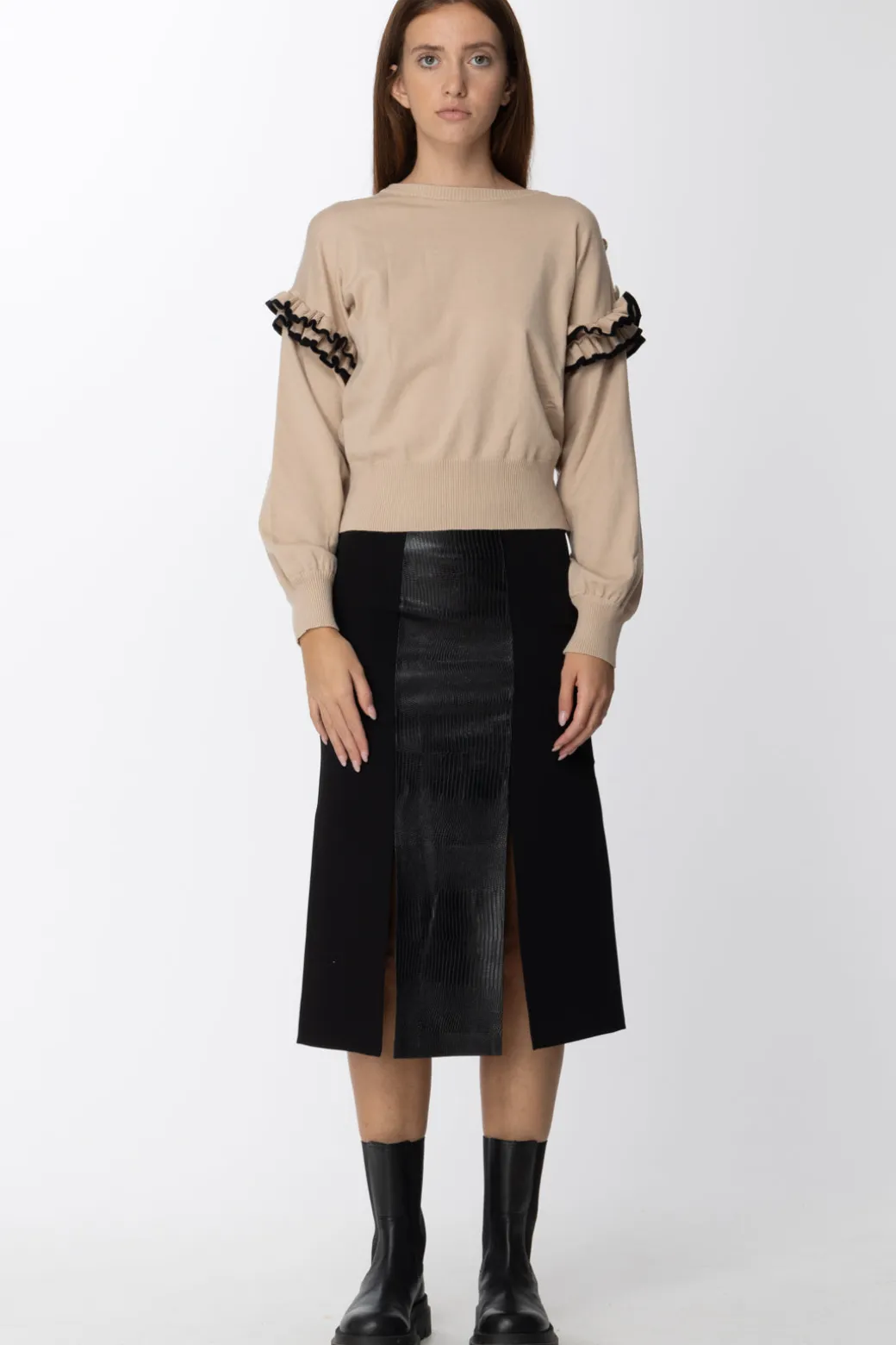 Maglia Simona Corsellini sofisticata e romantica, realizzata con un tessuto morbido e comfy, impreziosita poi sulle maniche da rouches con bordi a contrasto di colore. Semplice, ma sempre capace di esprimere il tuo stile unico.