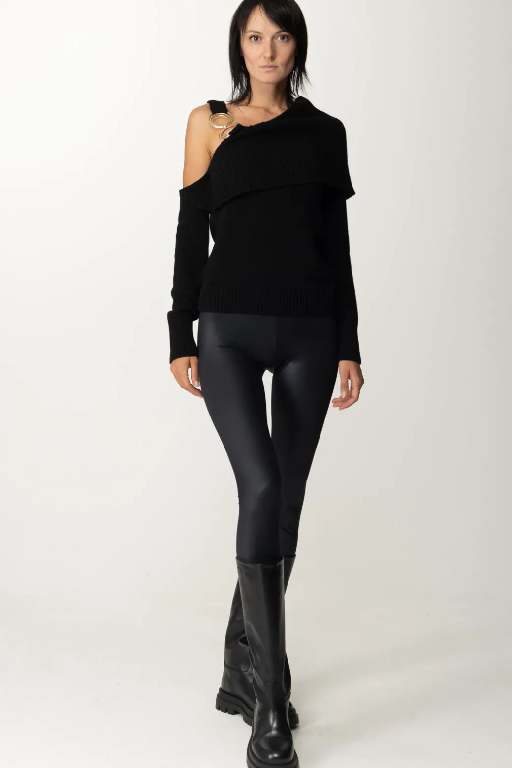 Maglia Simona Corsellini pronta a dare un twist di eleganza al tuo guardaroba invernale. A renderla particolare è lo scollo asimmetrico con effetto turn-up e la spallina che lo regge impreziosita da anelli gold. Da sfoggiare la sera per una femminilità senza tempo!