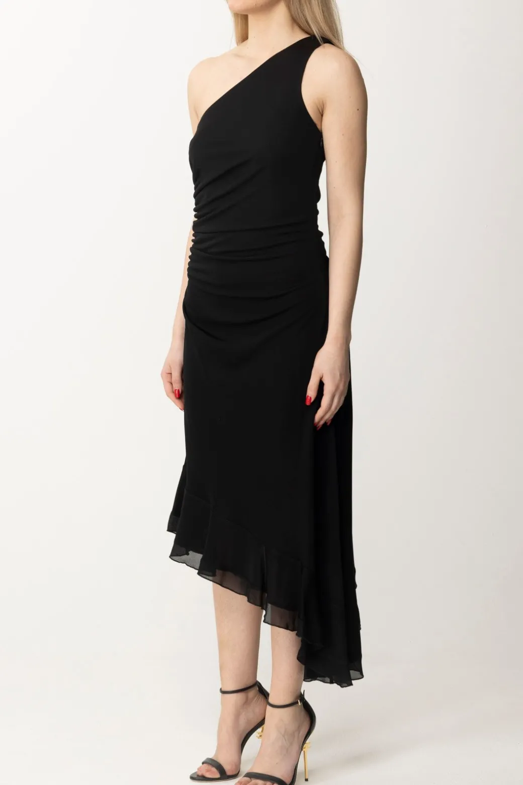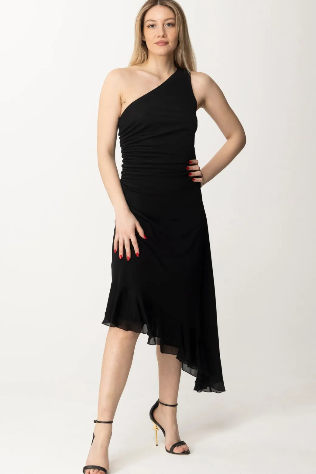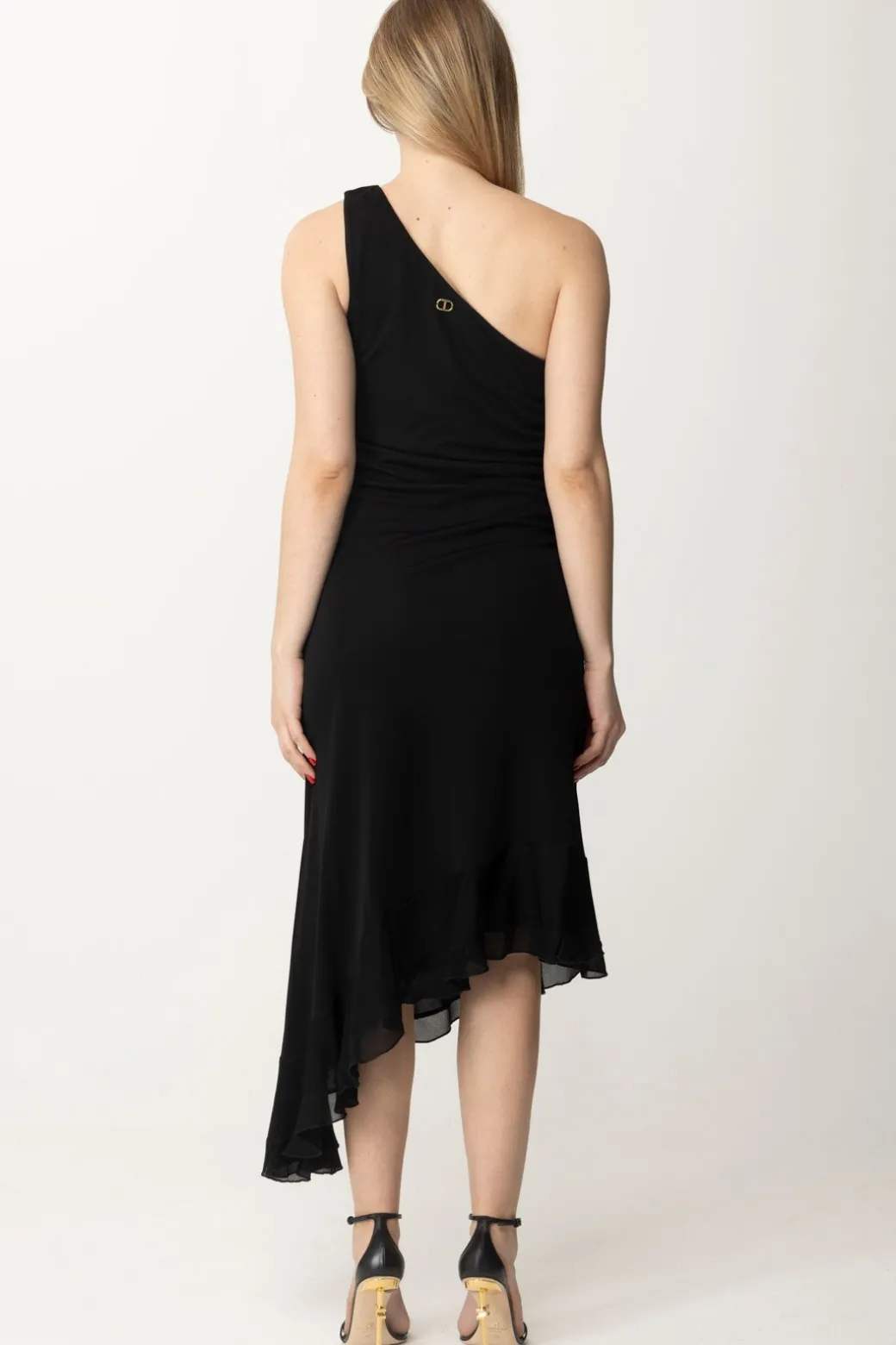 Eleganza e fascino caratterizzano questo abito longuette Twinset dal design monospalla, realizzato in jersey di viscosa e caratterizzato da drappeggi al fianco, fondo asimmetrico e balza in georgette. Un abito audace, femminile e sofisticato. Aggiunge un tocco di sensualità al tuo look da sera. A te non resta che illuminarlo con i tuoi accessori preferiti!
