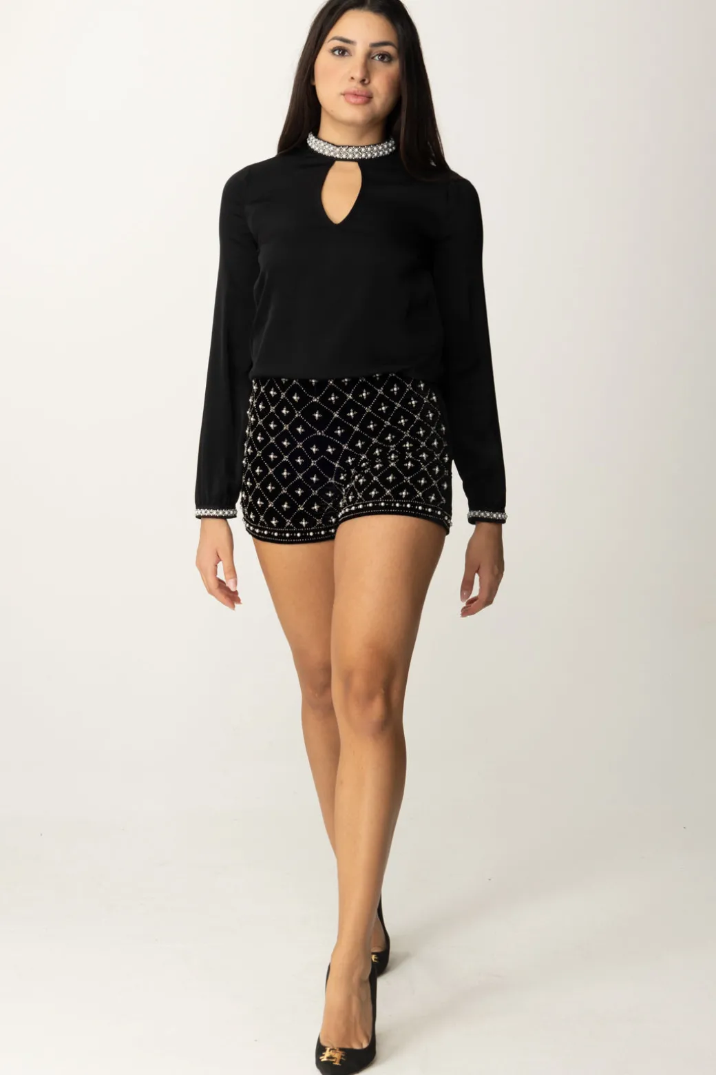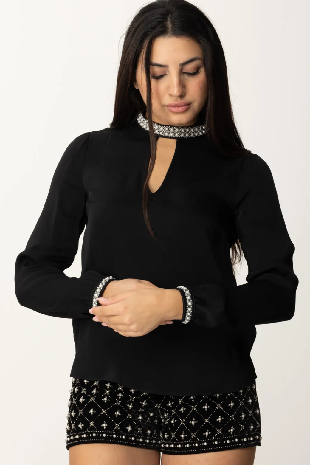 Una blussa Twinset dall’allure raffinato ed elegante. Presenta un design con un colletto alto impreziosito da perline e strass, uno scollo a goccia e maniche lunghe che riprendono lo stesso dettaglio luminoso del colletto. Un fascino glamour da indossare mattina e sera, con jeans o pantaloni eleganti.
