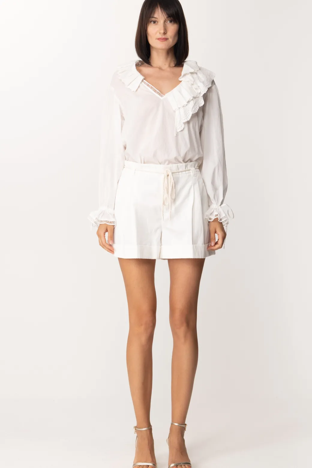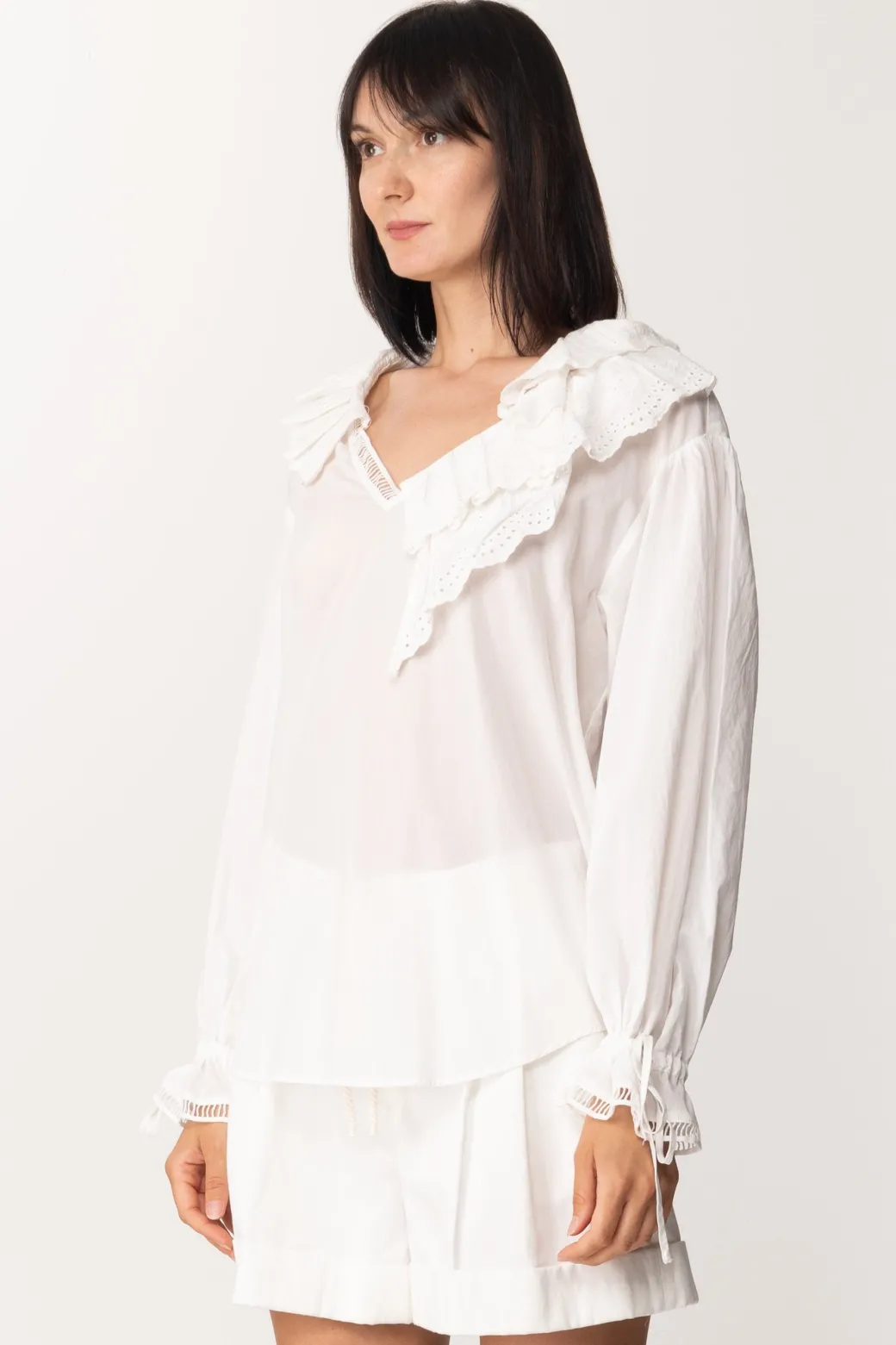 Un altro capo da aggiungere alla tua selezione di top candidi da sfoggiarei n tantissime occasioni. Busa Twin-Set piena di raffinatezze e originalità, dove all’ampio scollo a v si innestano volant asimmetrici ricamati in sangallo. Il motivo dei volant ritorna anche al polsini delle maniche ampie e lunghe. Perfetta da indossare sia all’intrno di capi a vita alta che lasciata libera di fluttuare!Ricamo presente anche sul retro.