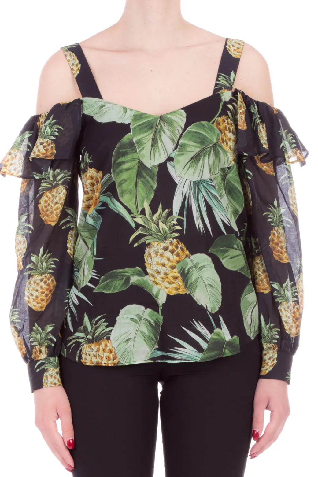 Perchè prenderti troppo sul serio quando puoi sfoggiare una stampa divertente come quella scelta per quesa blusa Twin-Set? E senza rinunciare alla tua femminilità: tanto la scollatura poggiata sul seno quanto il cut-out alle spalle aggiungono quel tocco di sensualità, insieme ai volant applicati sulle maniche lunghe. Jeans, shorts o pantaloni? Fai tu, sta bene con tutto!