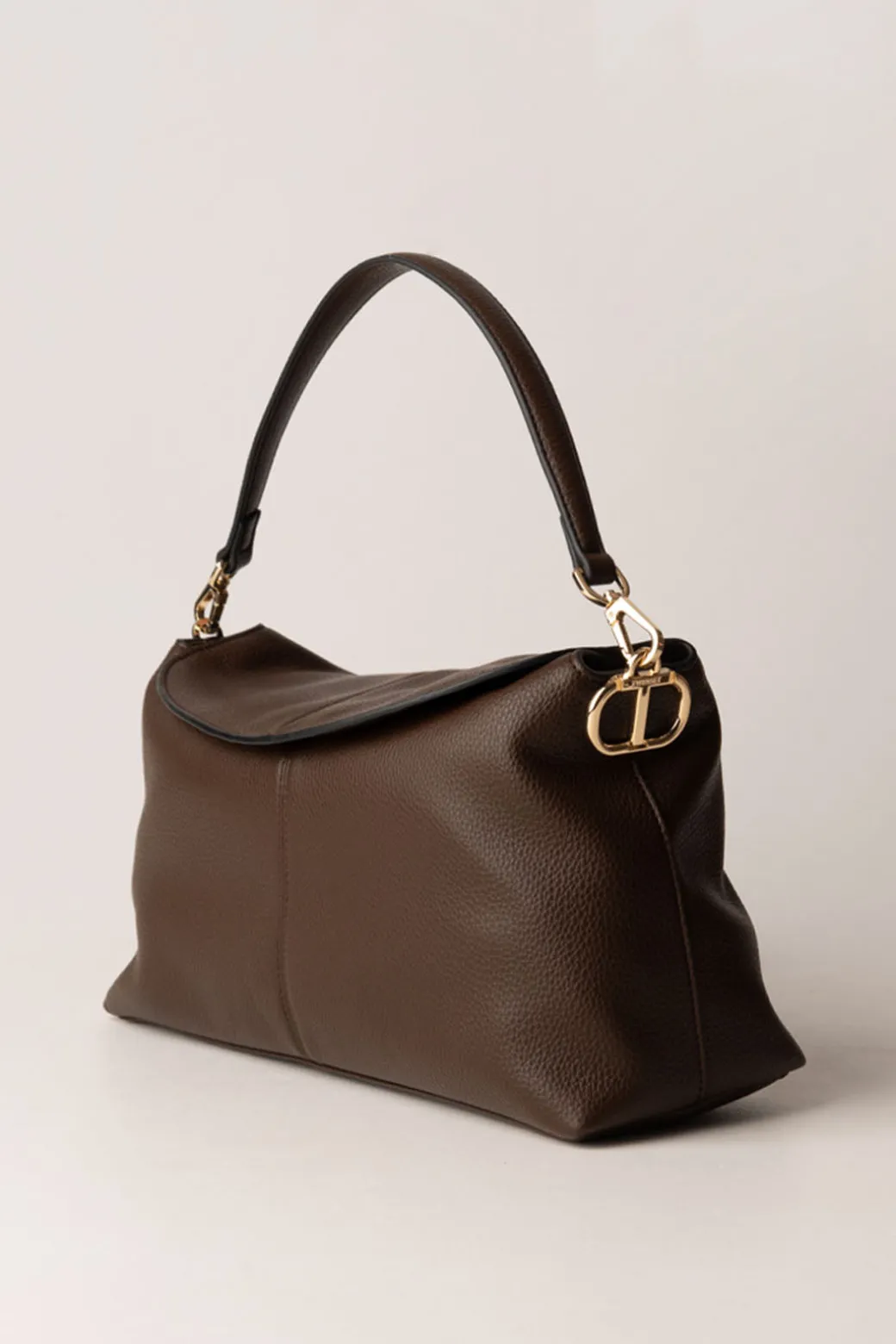 Design pulito e sofisticato, questa borsa Twinset dal design minimalista, si distingue per la sua semplicità raffinata. Realizzata con una texture martellata, chiusura con patta e manico rigido. A spalla o a tracolla? Scegli tu il look!