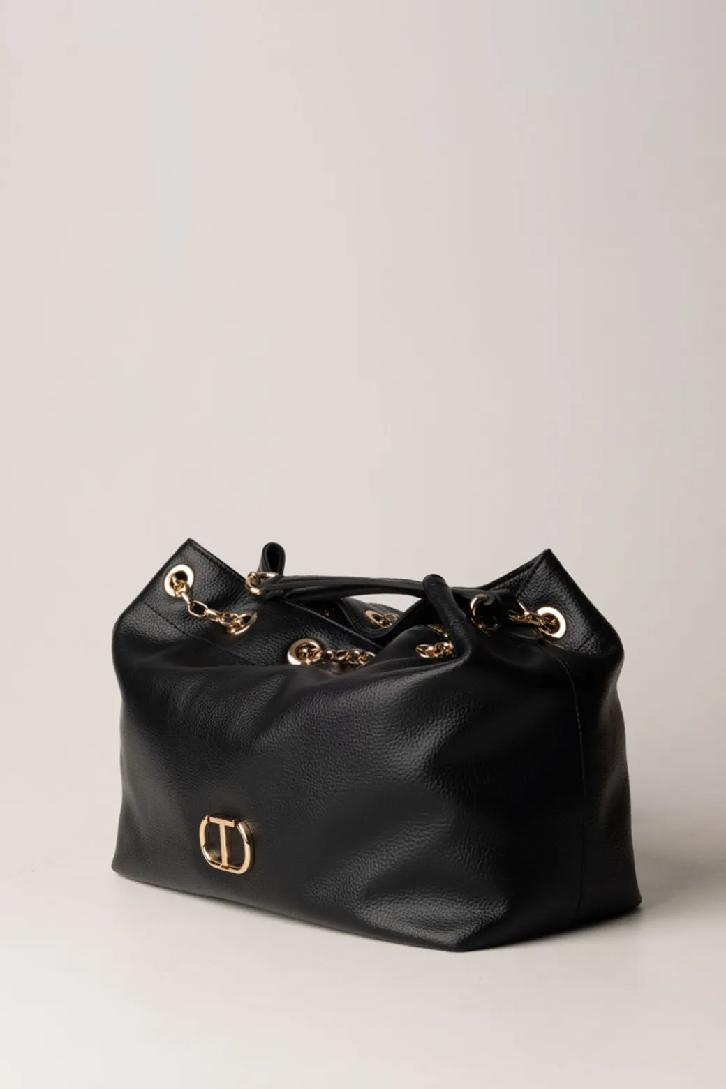 Design pulito e sofisticato, questa borsa Twinset dal design minimalista, si distingue per la sua semplicità raffinata. Realizzata con una texture martellata, chiusura con patta e manico rigido. A spalla o a tracolla? Scegli tu il look!