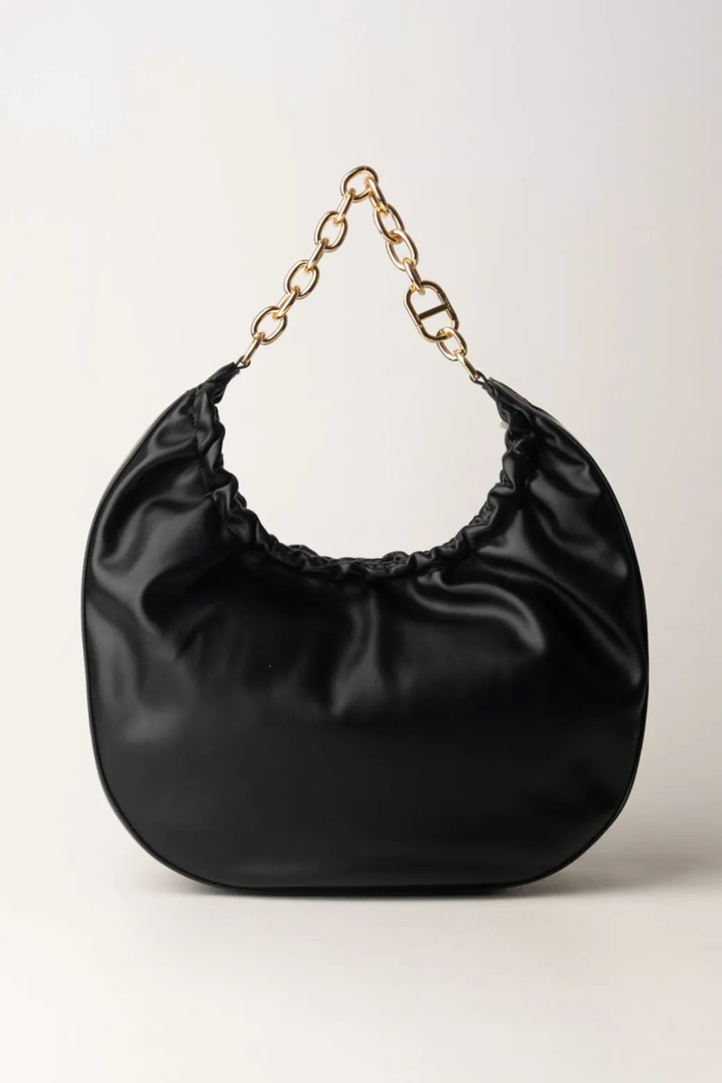 Borsa hobo Twinset dal modello arricciato, manico a mano con catena e inserto Oval T. Compatta ed estremamente elegante, amerai indossarla con il tuo minidress preferito per un look estivo sofisticato.