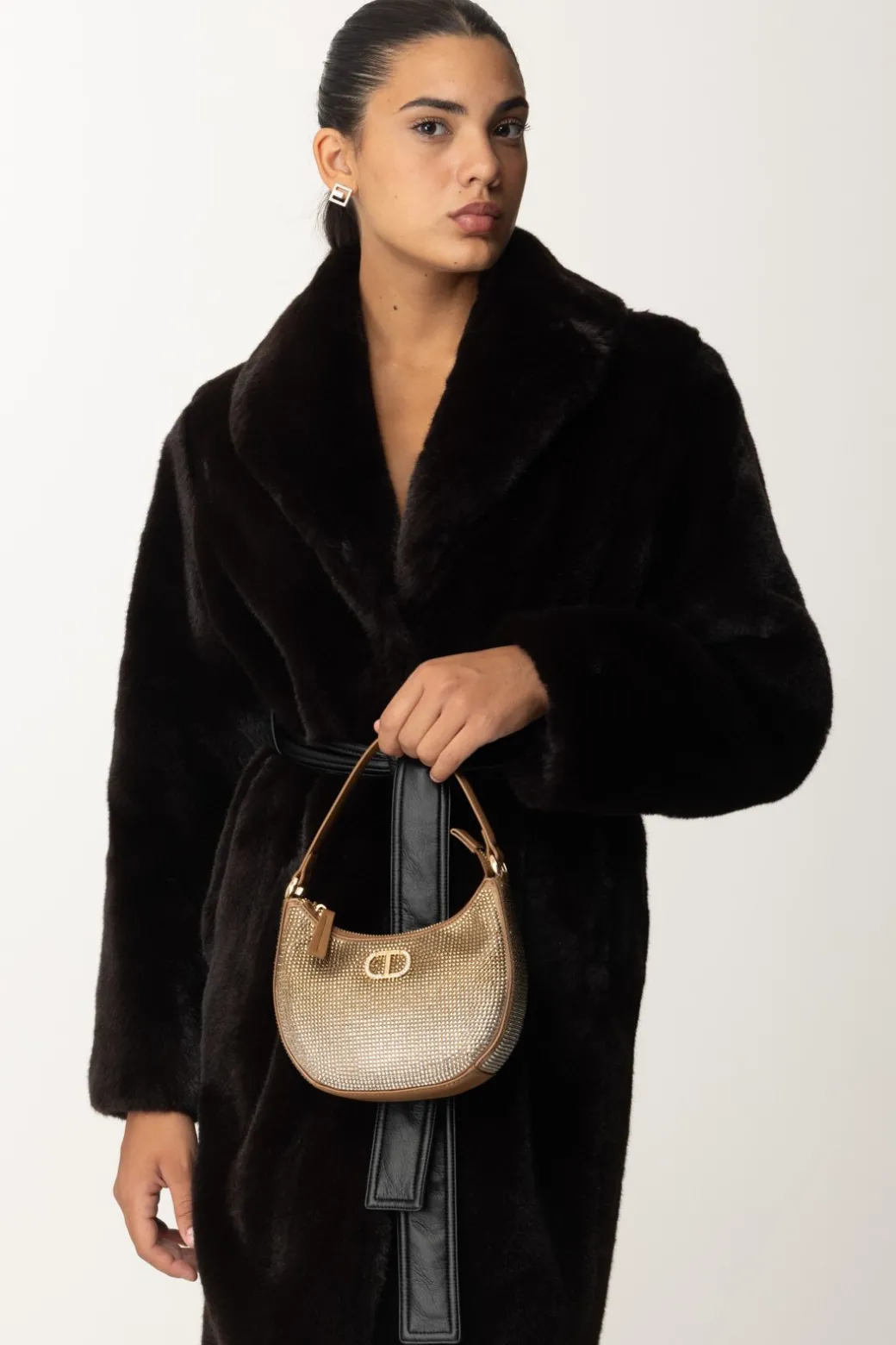 Una borsa che è tutta un luccichio! Una borsa hobo Twinset, dalla shape a mezzaluna da cui il nome “moon”, interamente ricoperta di strass in gradazione di colore per aggiungere glamour ai tuoi look invernali. Piccola ma d’impatto, l’accessorio che amerai per i tuoi party.
