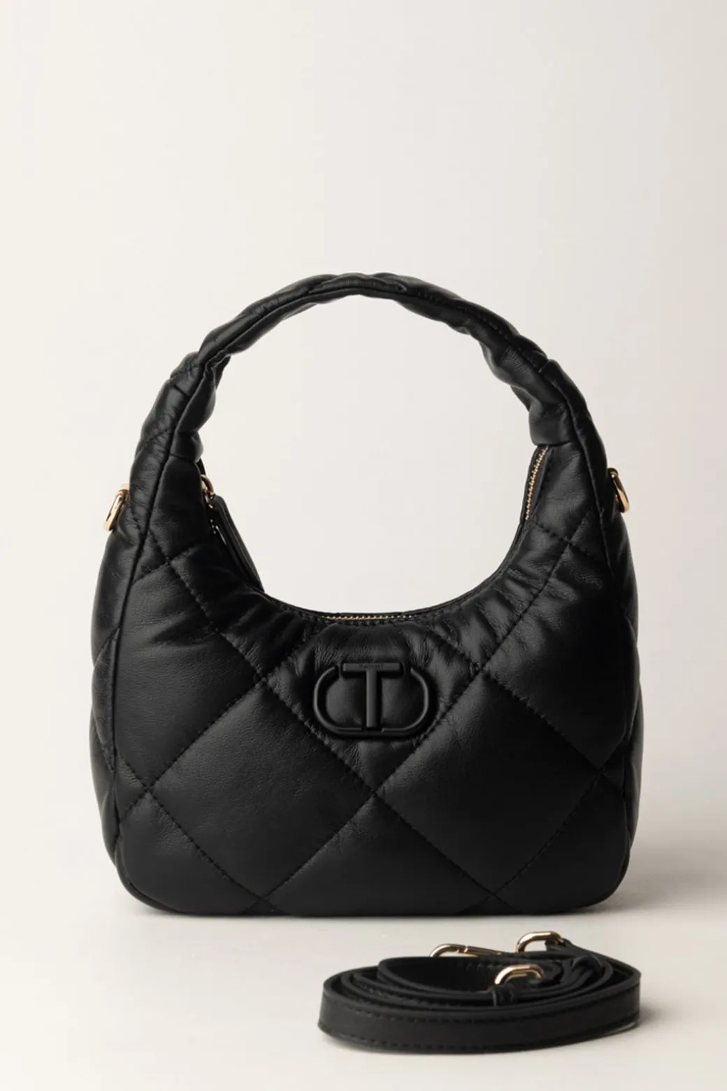 Borsa hobo Twinset piccola morbida e leggera, caratterizzata da una lavorazione quilted imbottita, logo Oval T verniciato in tinta e manico a mano con tracolla rimovibile.Abbinala al tuo outfit per un look invernale chic!