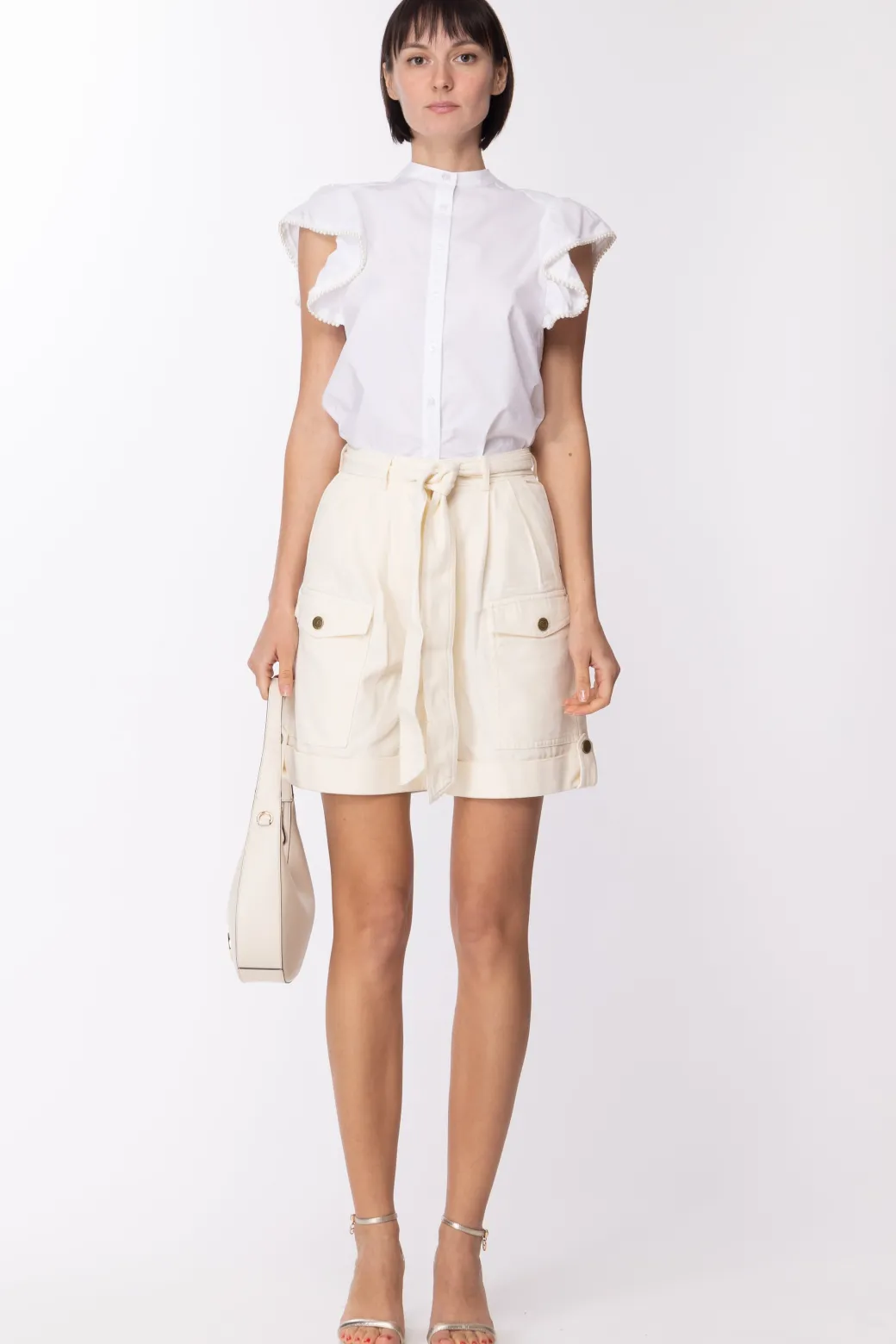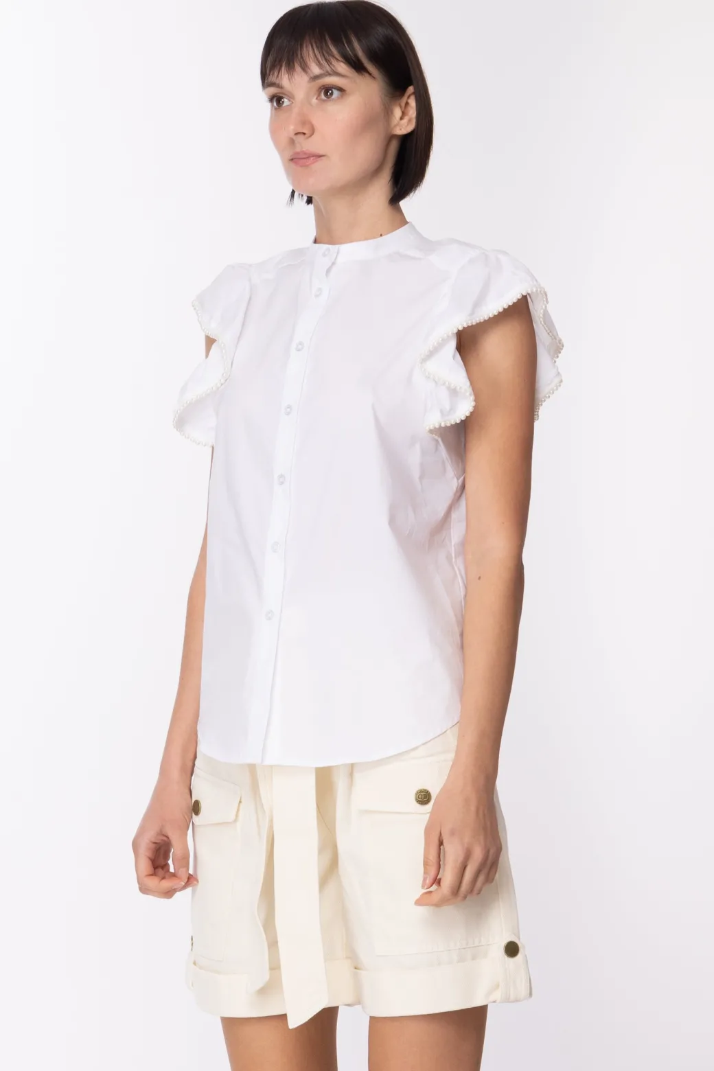 Un top che si distingue tra gli altri basic del tuo guardaroba: una dolce camicia Twin-set corredata di manichette volant orlate di perline. La vestiblità dritta ti aiuta a creare un effetto blusato sul busto se deciderai di indossarla dentro capi a vita alta, concentrando l’attenzione sulla parte alta del tuo outfit.