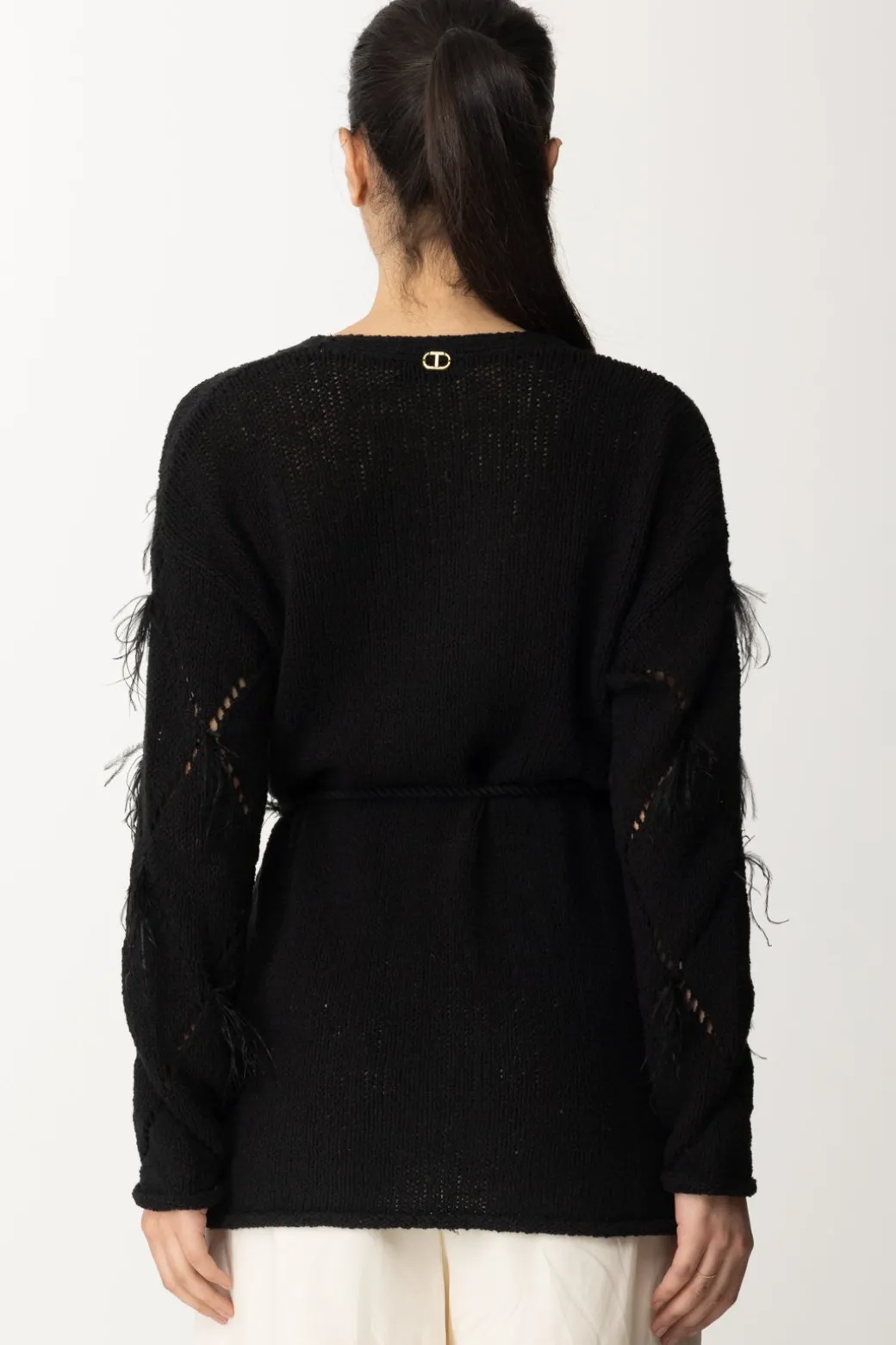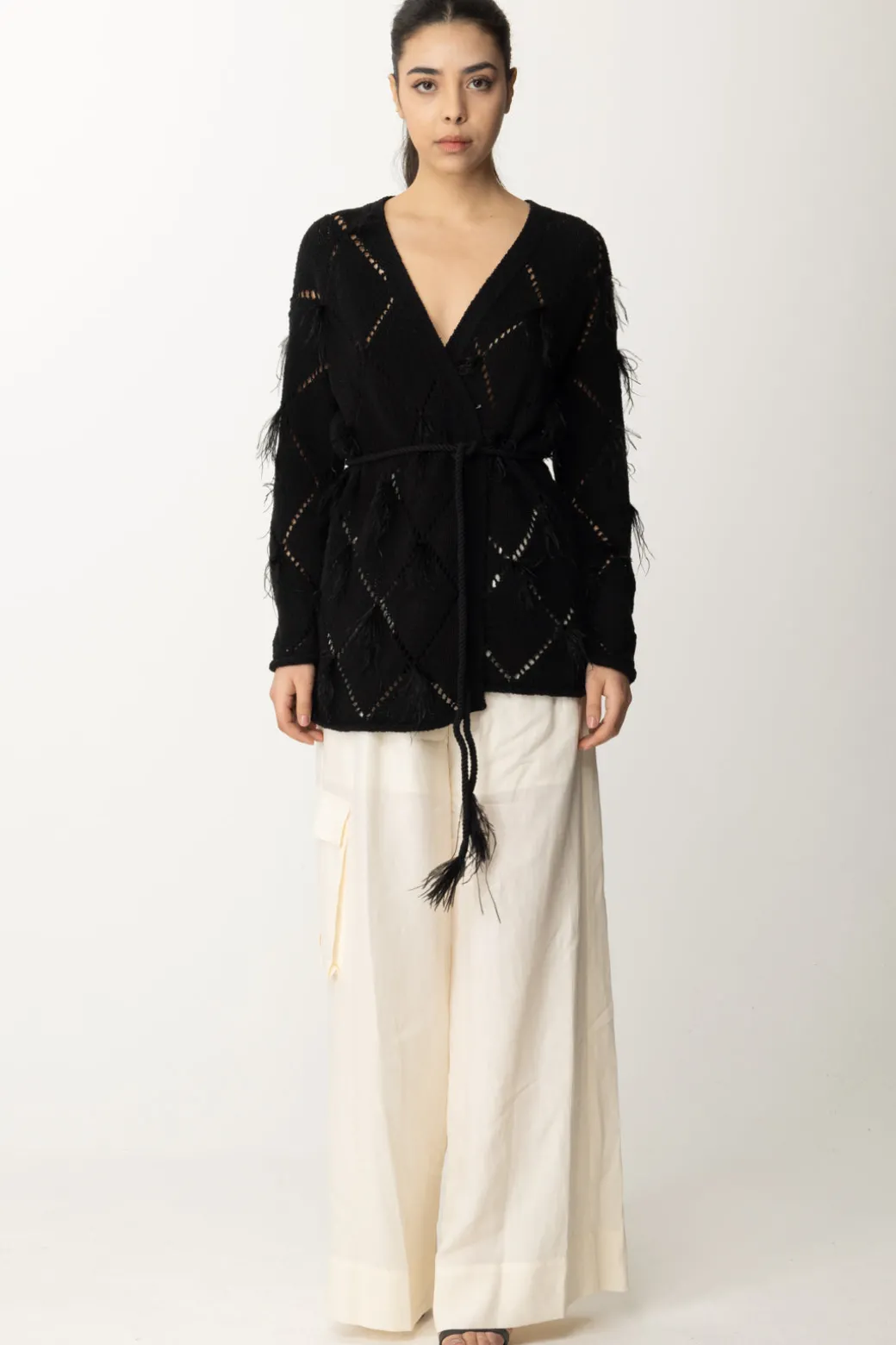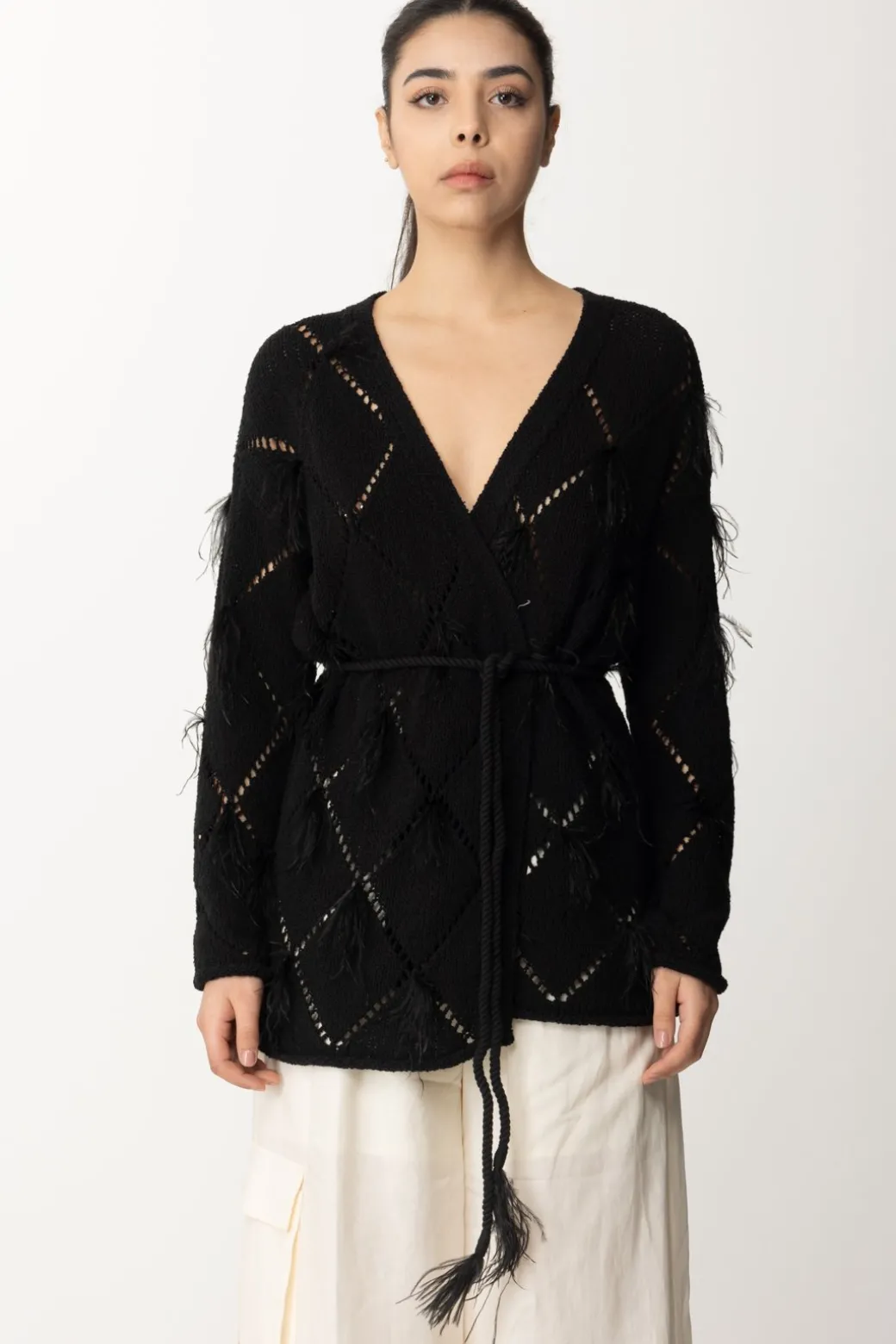Un top che conquista per la sua delicatezza e originalità: cardigan Twinset caratterizzato da maglia traforata a losanghe con applicazione di piumette, che gli donano un’allure ancora più eterea. Si avvolge intorno alla silhouette e si sagoma in vita grazie ad un sottile cinturino abbinato: il tuo “strato” più romantico del tuo guardaroba, da provare in tantissime combinazioni.