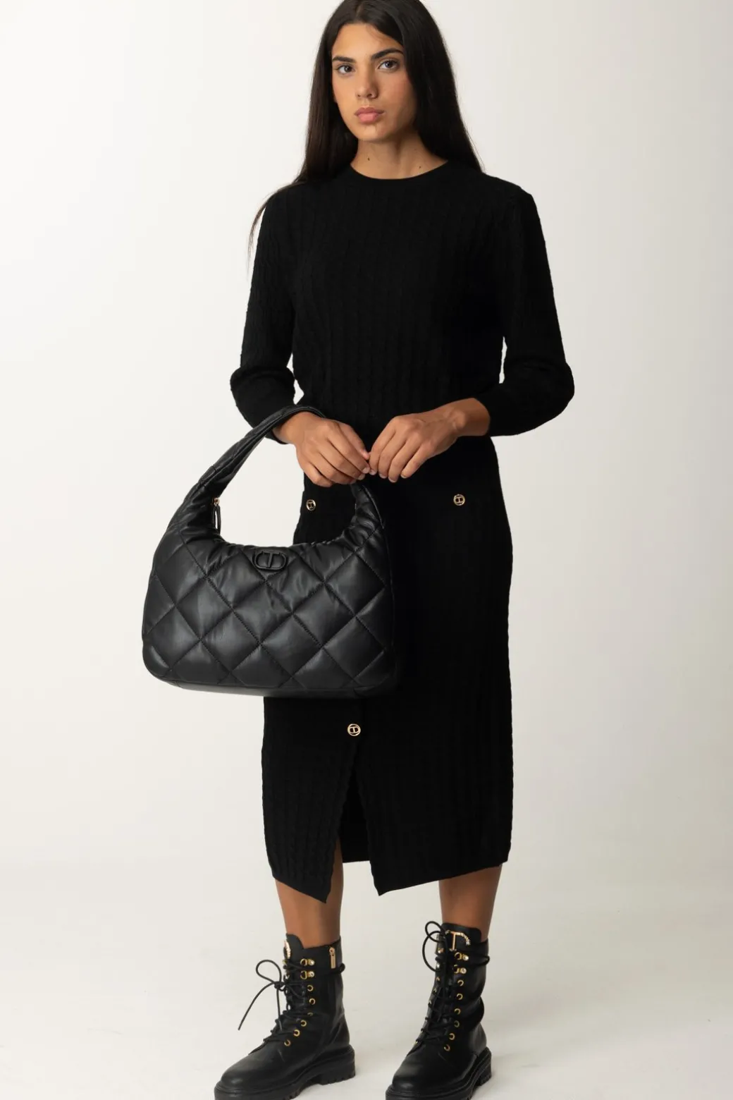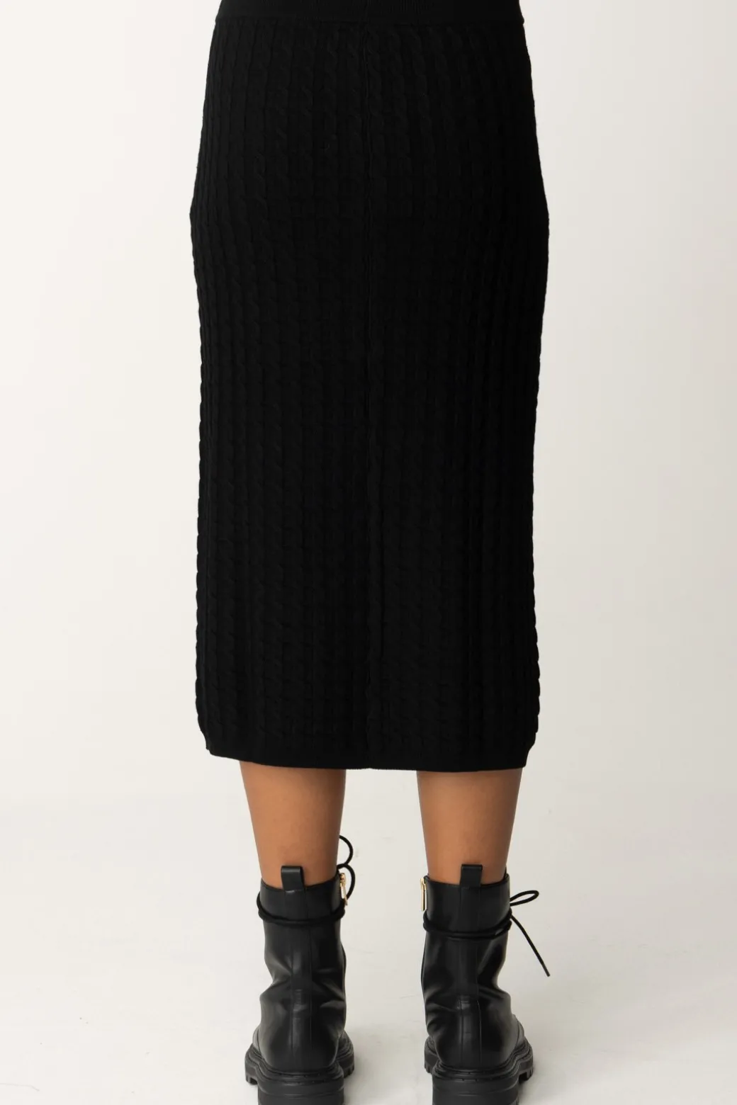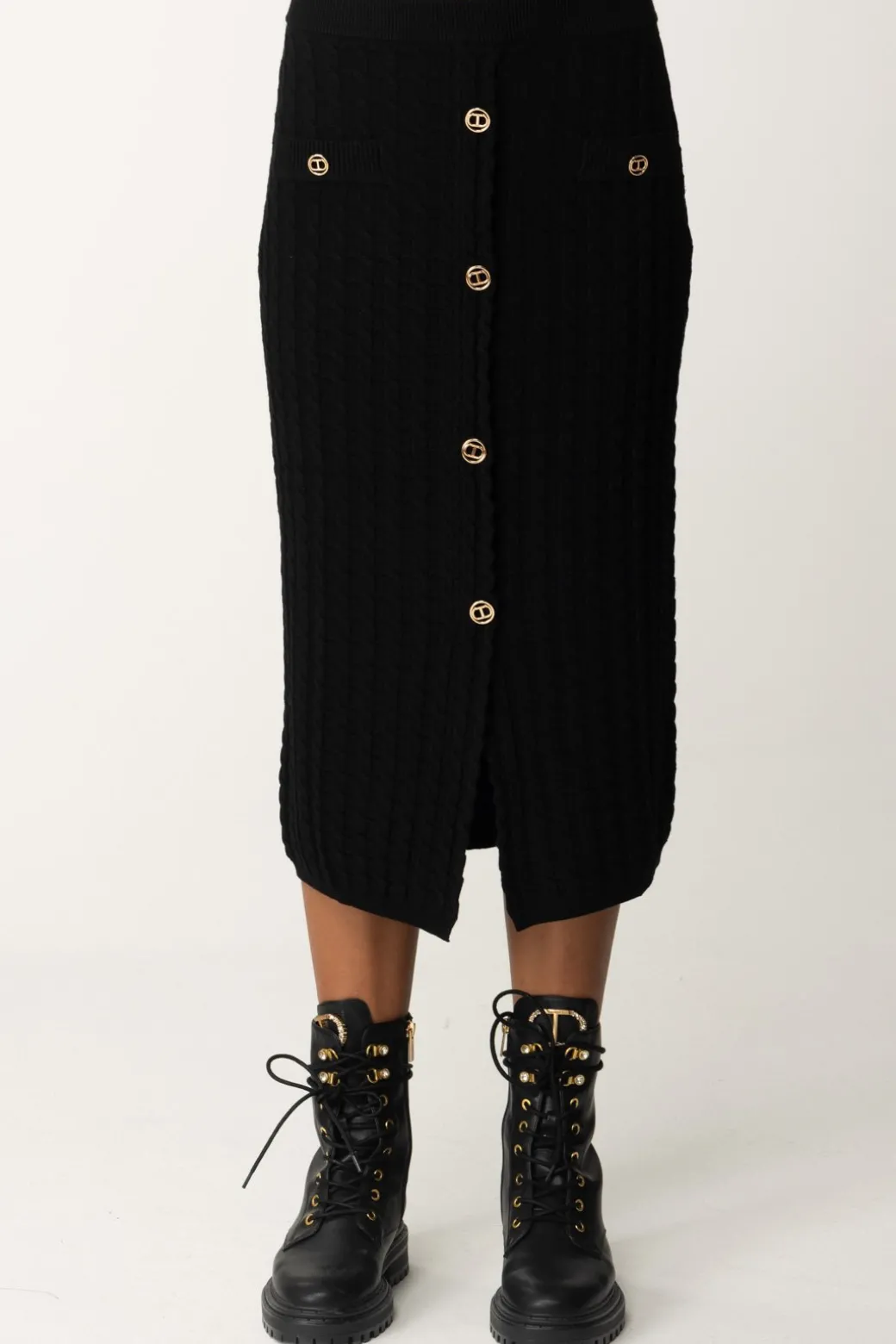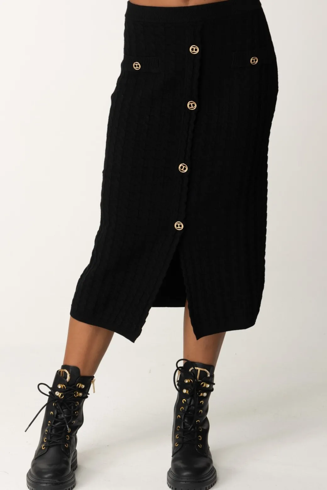 Sono un passe-par-tout della stagione fredda e per questo dovresti averle tutte: a partire da questa gonna in maglia Twinset con la sua lavorazione a incrocio a rilievo e il taglio midi. I bottoncini sono un puro ornamento, che simula la presenza di un’apertura frontale che in realtà si riduce allo spacchetto a fine abbottonatura: un capo versatile, che potrai indossare tanto con sneakers e t-shirt wuanto con body e decolletes.