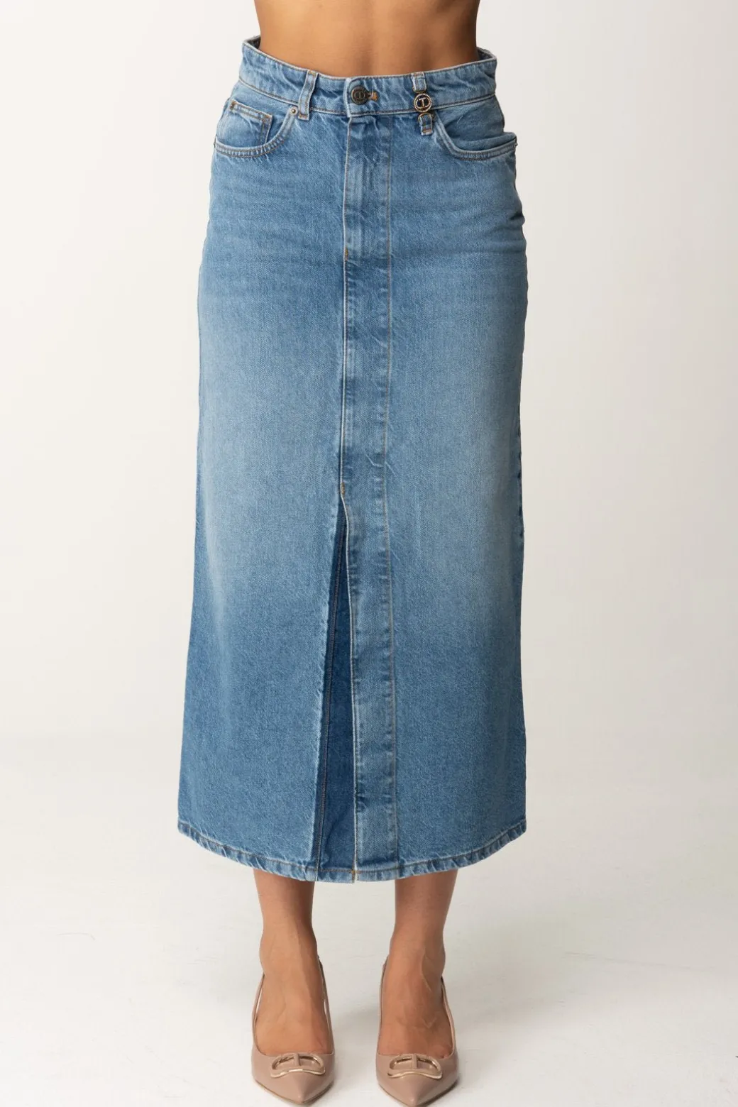 Gonna Twinset dal modello midi a vita alta, realizzata in denim e caratterizzata da uno spacco frontale che aggiunge un tocco casual chic. Abbinala a una camicia bianca annodata e sandali con tacco per un outfit sofisticato.
