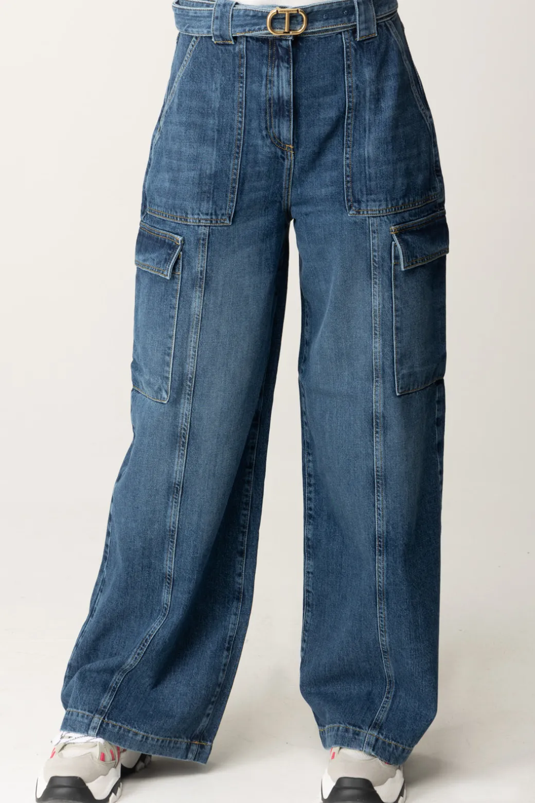Jeans Twinset che rendono originale il modello cargo combinandolo con una silhouette a palazzo, con vita alta contrassegnata da cintura logata in denim. Un bottom che amerai indossare nei tuoi look da giorno e tempo libero, in outfit rilassati con sneakers e felpe o più sofisticati con maglie e un po’ di tacco.