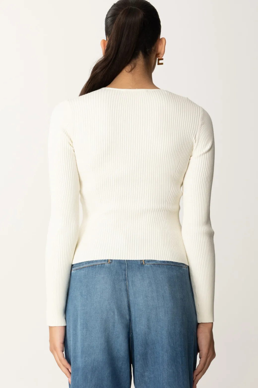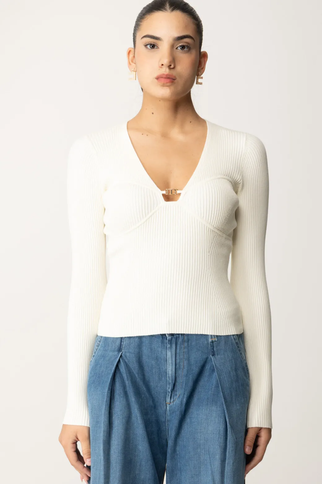 Seducente nella sua semplicità, questa maglia Twinset dalla linea fitted mette in risalto le tue forme grazie al profondo scollo a v con placchetta logo in oro e alle coppe sagomate che enfatizzano il seno. Un capo versatile e femminile, perfetto per aggiungere una nota sexy ai tuoi outfit da giorno e tempo libero.