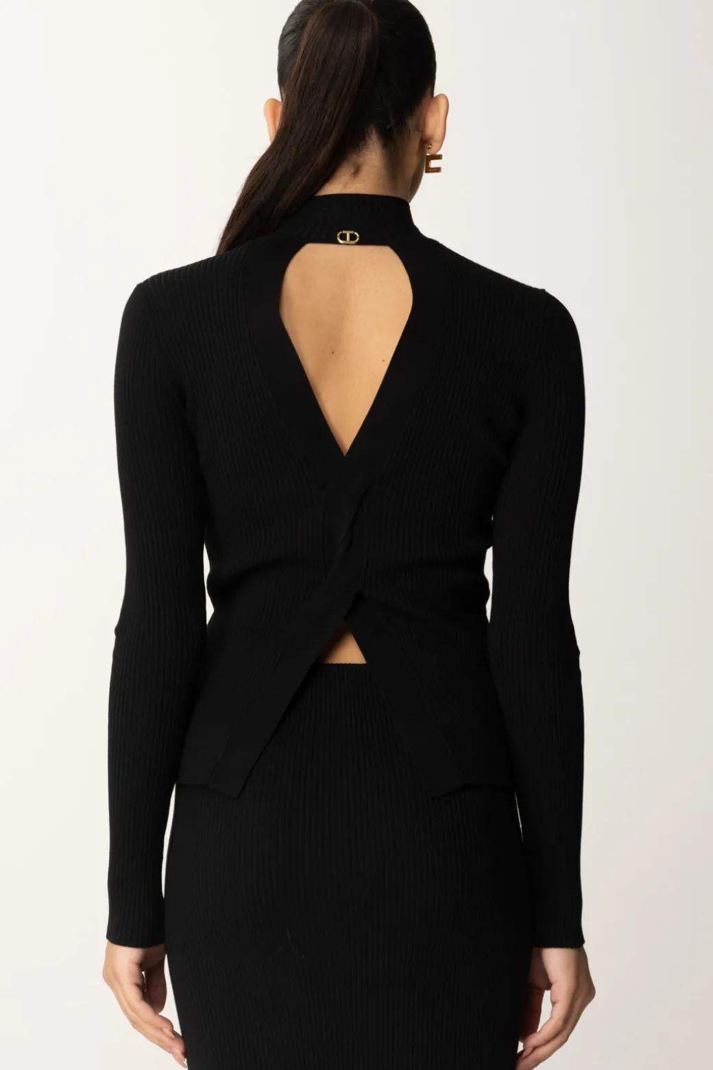 Maglia Twinset in misto viscosa con effetti speciali: se il fronte è basico, un classico lupetto con tessuto a coste, il retro presenta un’apertura e un intreccio che si concluse con uno spacchetto che la rende super, super intrigante. Un modo semplice ma non basico per completare i tuoi look di stagione, avendo sempre qualcosa con cui sorprendere e sorprenderti con eleganza.