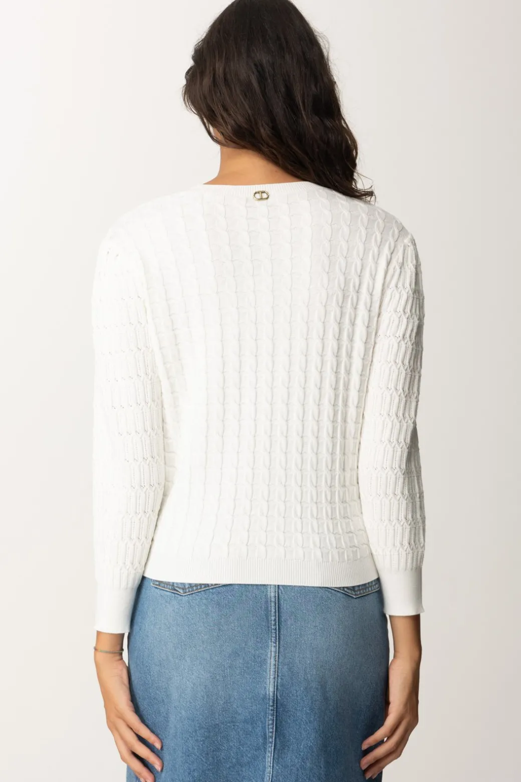 Delicata e versatile maglia Twinset girocollo realizzata in mix di punti, caratterizzata da maniche a tre quarti e un fit morbido con orli e polsini a costine. Perfetta da indossare h24 con i bottom più diversi: sarà un bel tocco di grazia per ogni tipo di outfit. Placchetta logo Oval t sul retro.