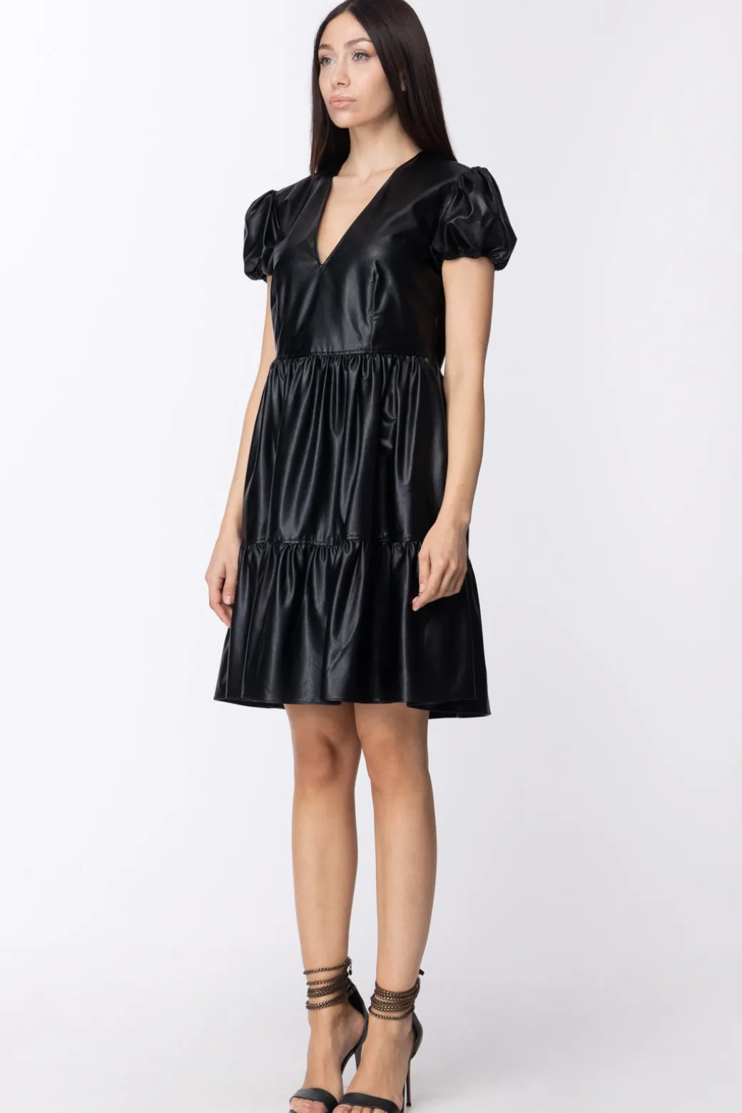 Il tuo prossimo look da party potrebbe essere questo: dei sandali dal tacco svettante, una borsa con tracolla a catena gold e questo sfiziosissimo mini abito Twin set in tessuto spalmato effetto pelle, con il suo susseguirsi di balze sul design svasato. Maniche corte a palloncino, scollo a v discreto, piccoli accorgimenti, grande classe.Vestibilità ampiaTaglio corto