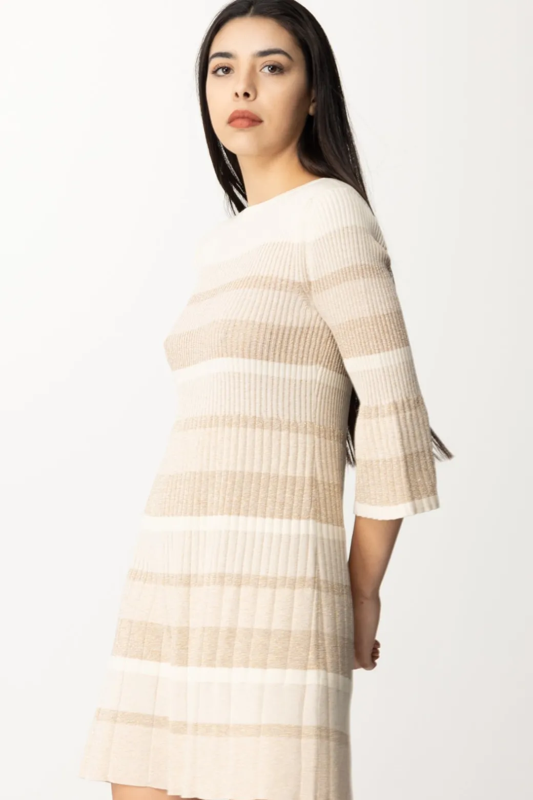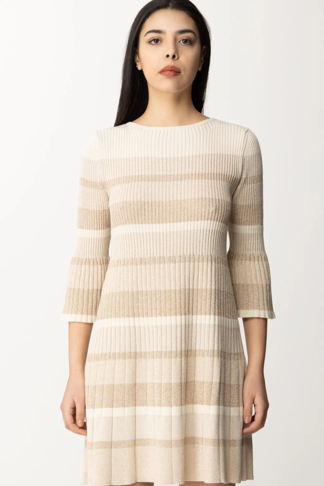 Eleganza da signorinella che piace a donne di ogni età: se non l’hai già riconosciuto per lo stile impeccabile, è un delicato abito Twinset in maglia, dove al motivo delle costine verticali si sovrappone una stampa a righe orizzontali in varie gradazioni. Una mise delicata, con maniche a tre quarti svasate che replicano il gioco di design lungo la silhouette, da indossare tanto con le ballerine di stagione quanto con un tacco.