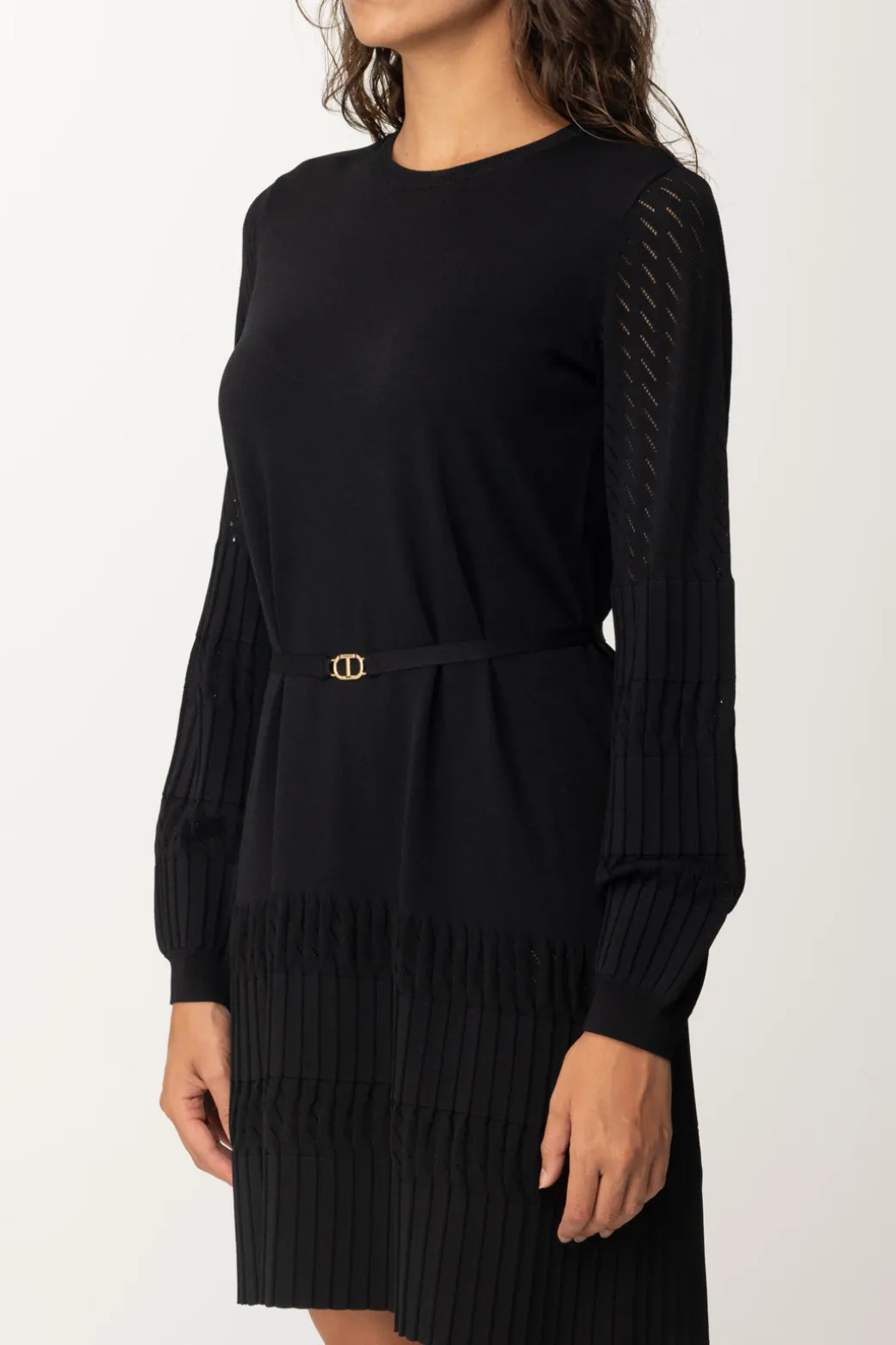Un mix di lavorazioni – lungo la gonna, lungo le maniche – rendono questo abito in maglia Twinset una mise sfiziosa ed elegante, completata da una cinturina al punto vita con logo Oval T che sottolinea la silhouette con discrezione. Molto elegante con un tacco, ma bello anche con stivali flat e anfibi che aggiungono quel tocco di grinta che non stona mai con gli abiti di questo brand.