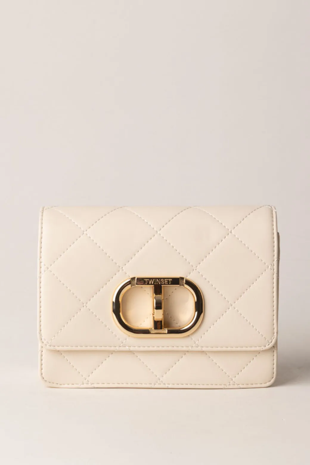 Questa mini borsa Twinset a tracolla sarà il tuo piccolo scrigno di stile! Ha un design a rombi, con una chiusura a patta impreziosita dal logo Oval T e tracolla in catena. Ideale per un look serale, abbinala a un vestito e tacchi alti.