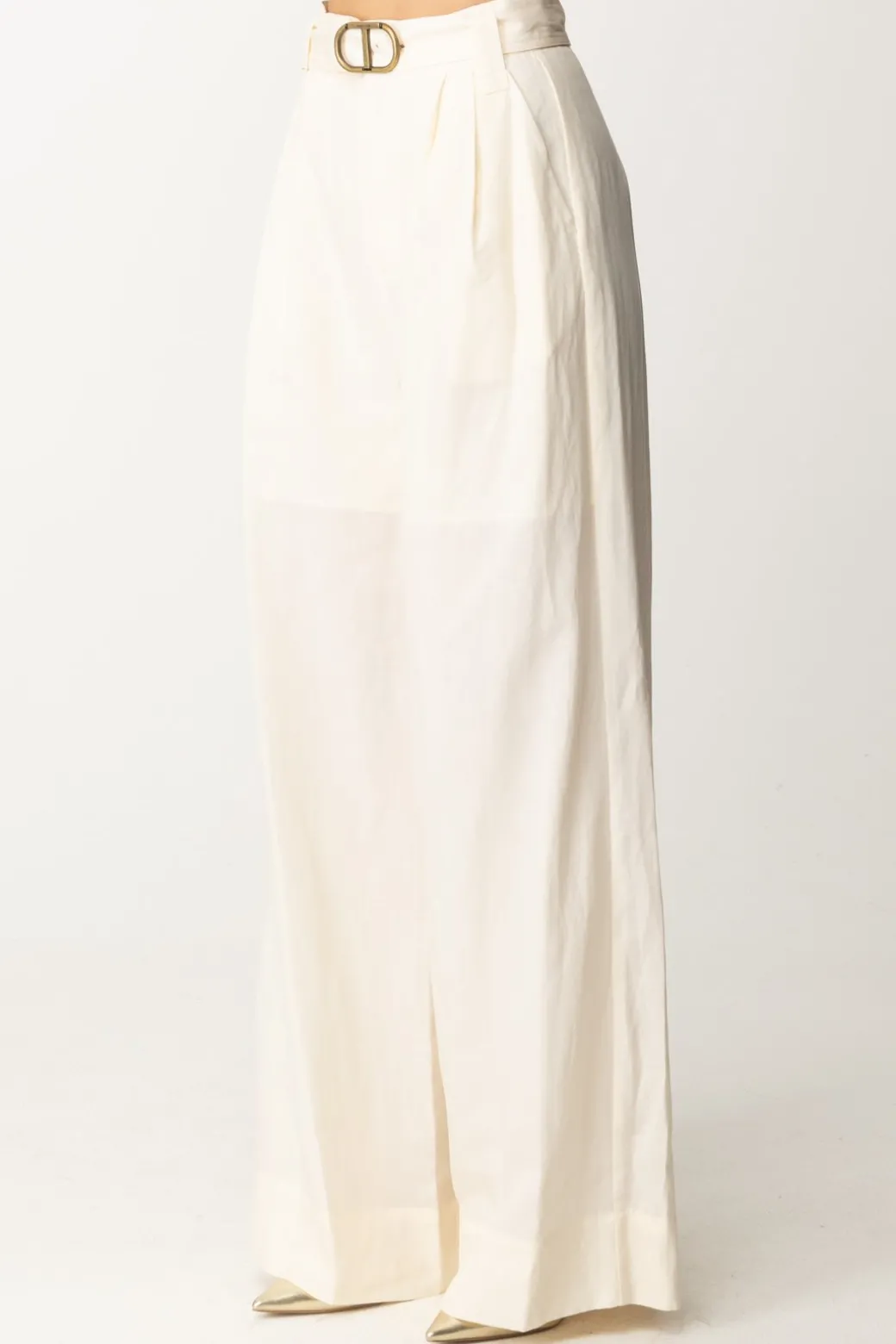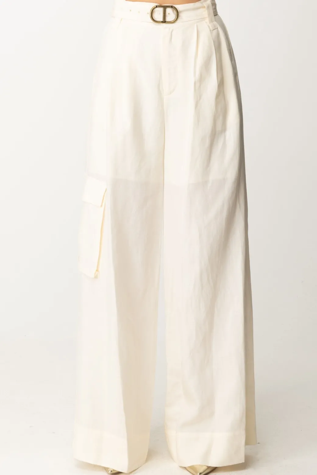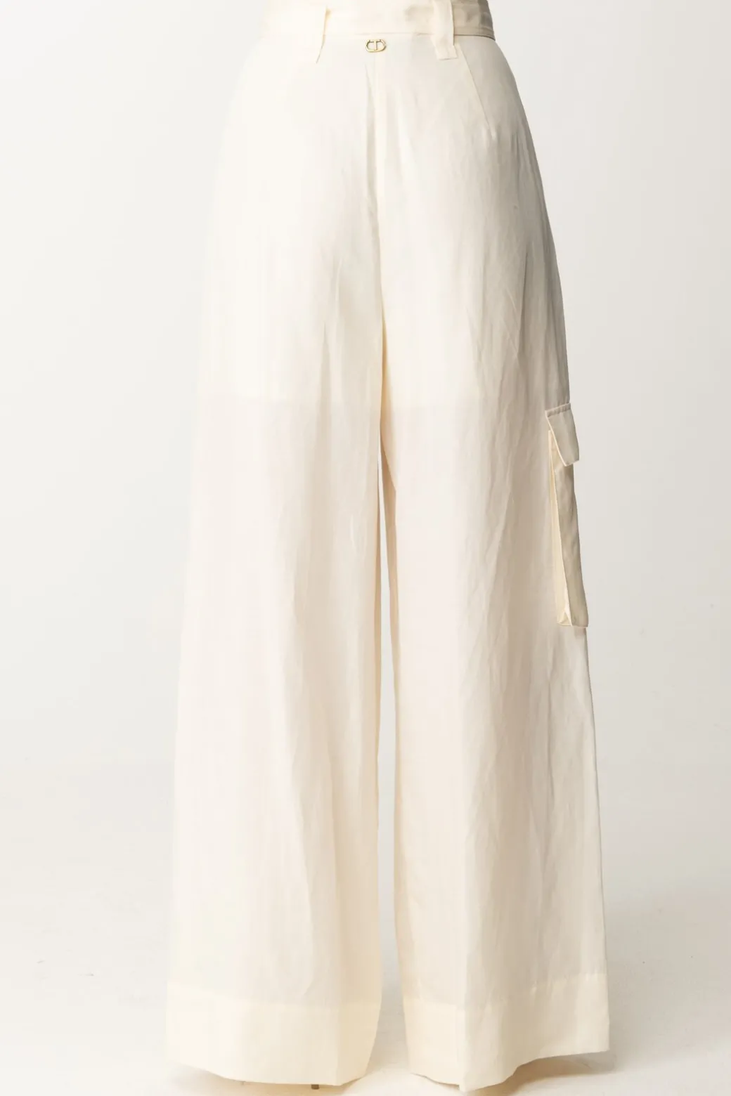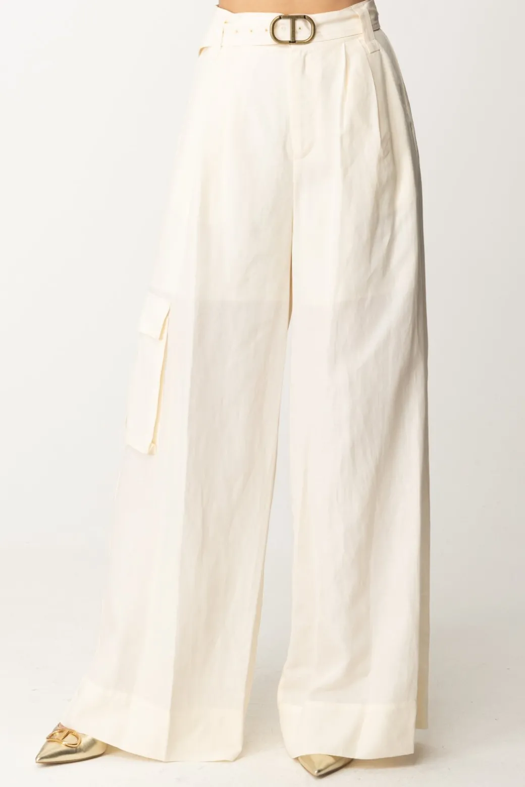 Pantaloni Twinset dal taglio wide leg, dotati di cintura logata in vita e tasca laterale su un lato della gamba. Questo capo offre un mix di stile moderno e dettagli di tendenza, perfetto per un look sofisticato.