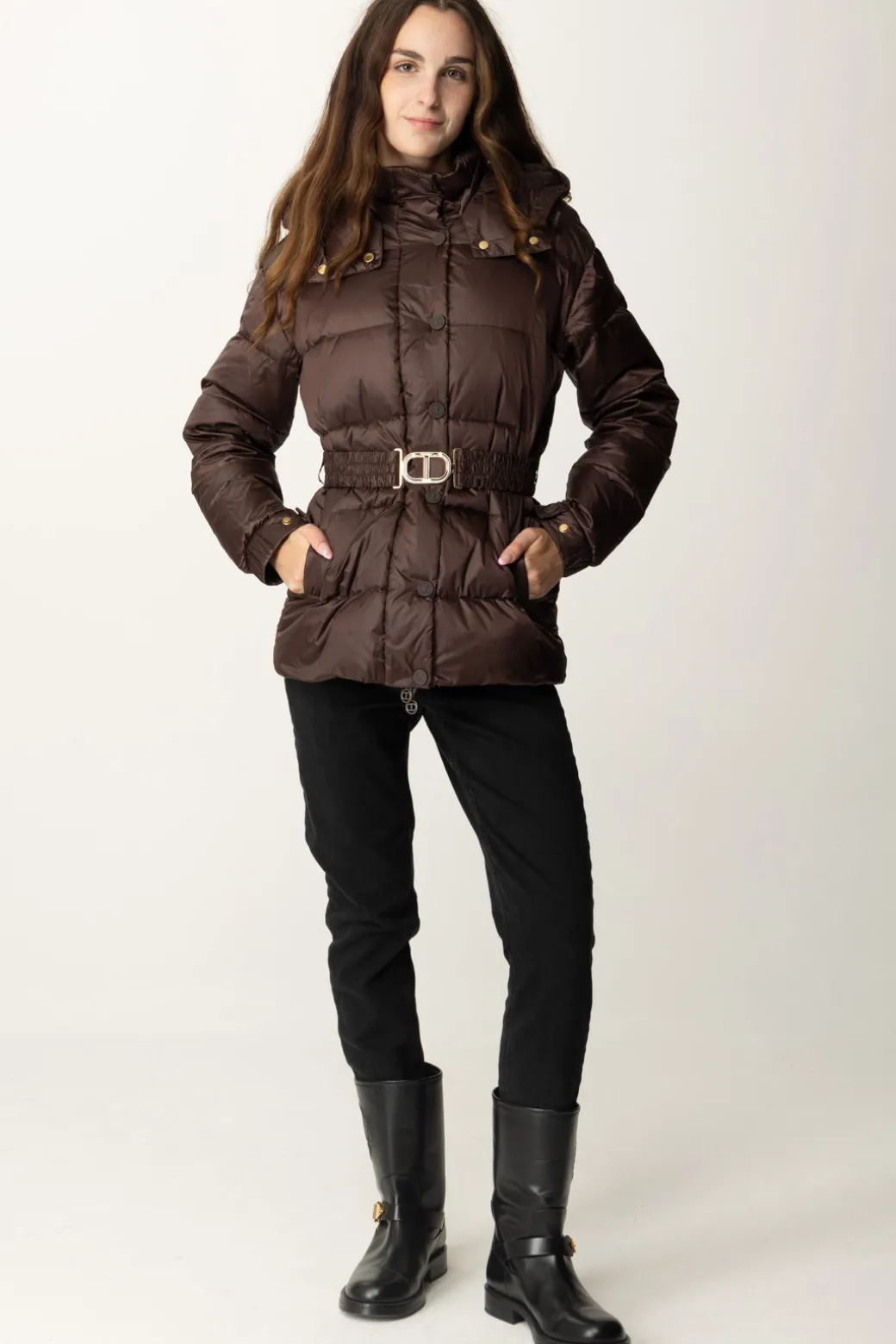 Questo piumino Twinset in nylon trapuntato dona vibes funzionali e al tempo stesso ricchi di stile. La sua silhouette elegante con cintura logata in vita e l’imbottitura comoda lo rendono ideale per le giornate fredde. Abbinalo a leggings e stivaletti per un look invernale urbano.
