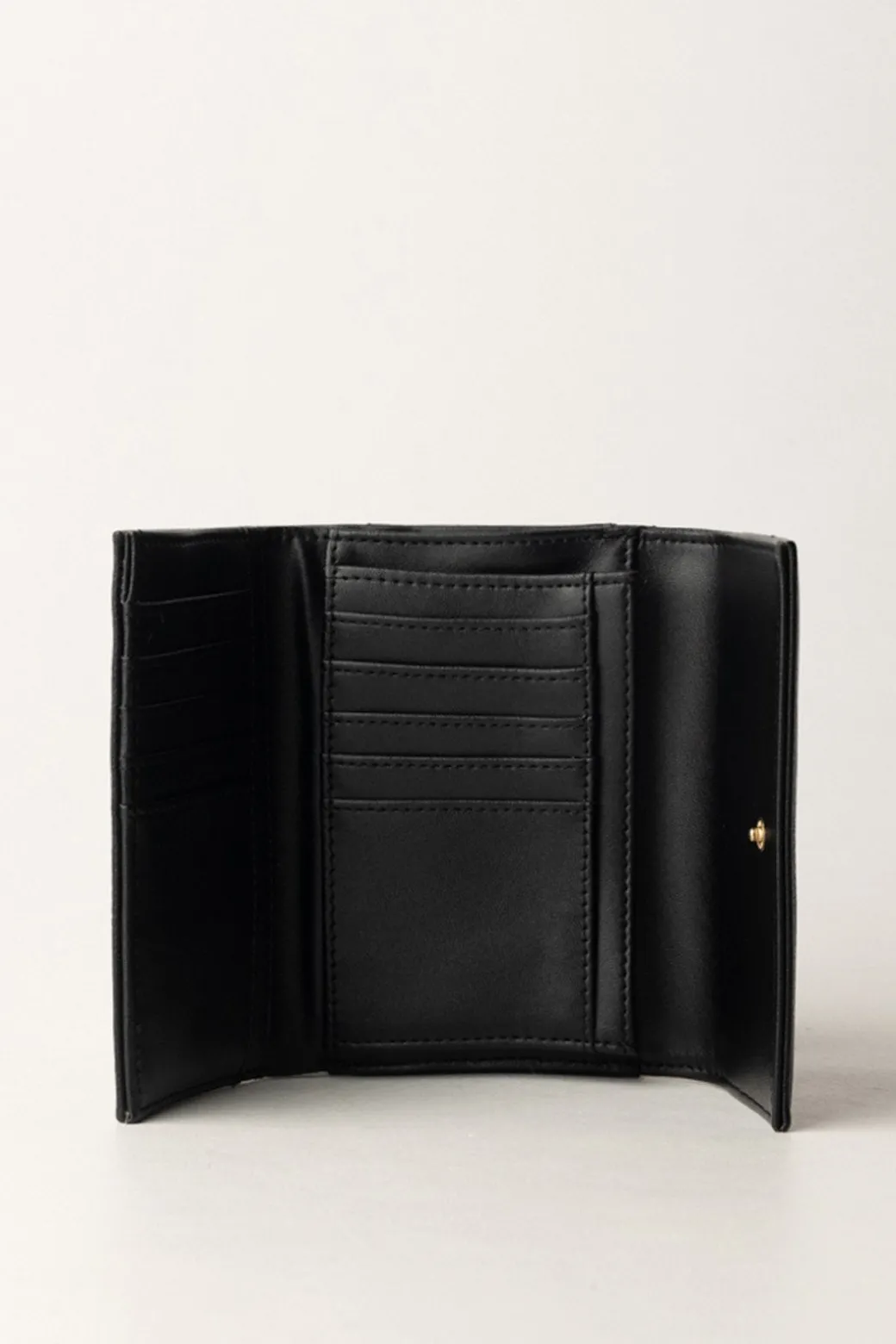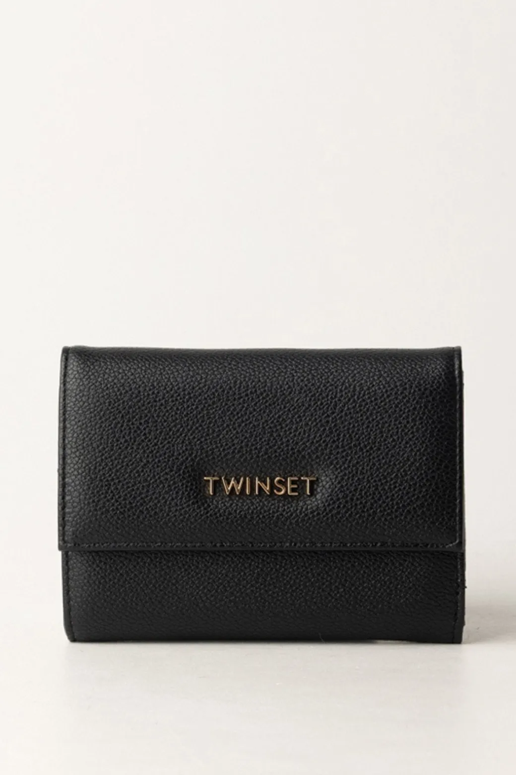 Compatto e pratico portafogli Twinset di dimensioni medie, realizzato in materiale sintetico effetto pelle martellata con impresso il logo lettering in metallo. Chiusura con bottone a pressione, presenta tanti scomparti interni porta carte e una tasca esterna con zip portamonete.