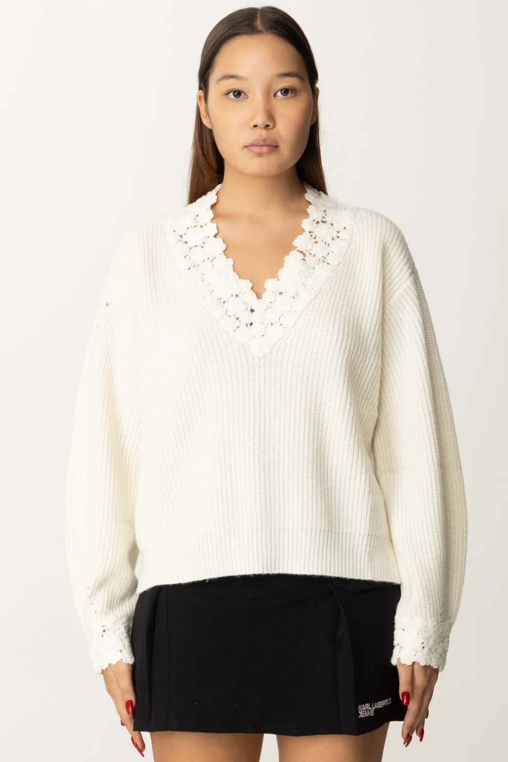 Pullover Twinset in misto lana dallo stile romantico e cozy. Impreziosito con dettagli in pizzo sullo scollo e sui polsini, dona un tocco delicato e femminile al tuo look, perfetto da abbinare a gonne o jeans per bilanciare per un mood versatile e chic.