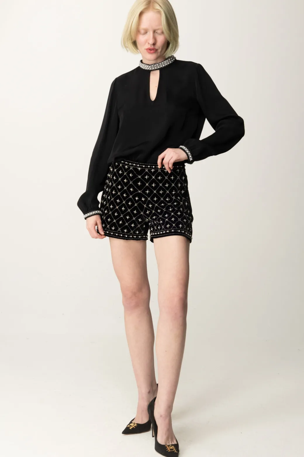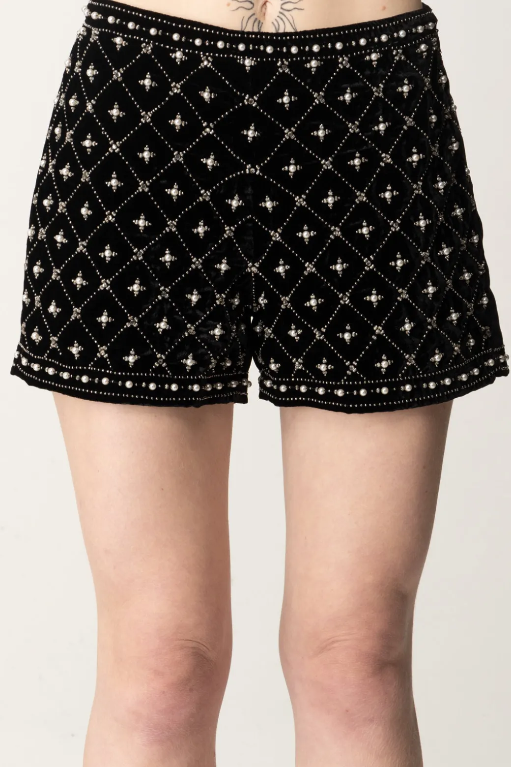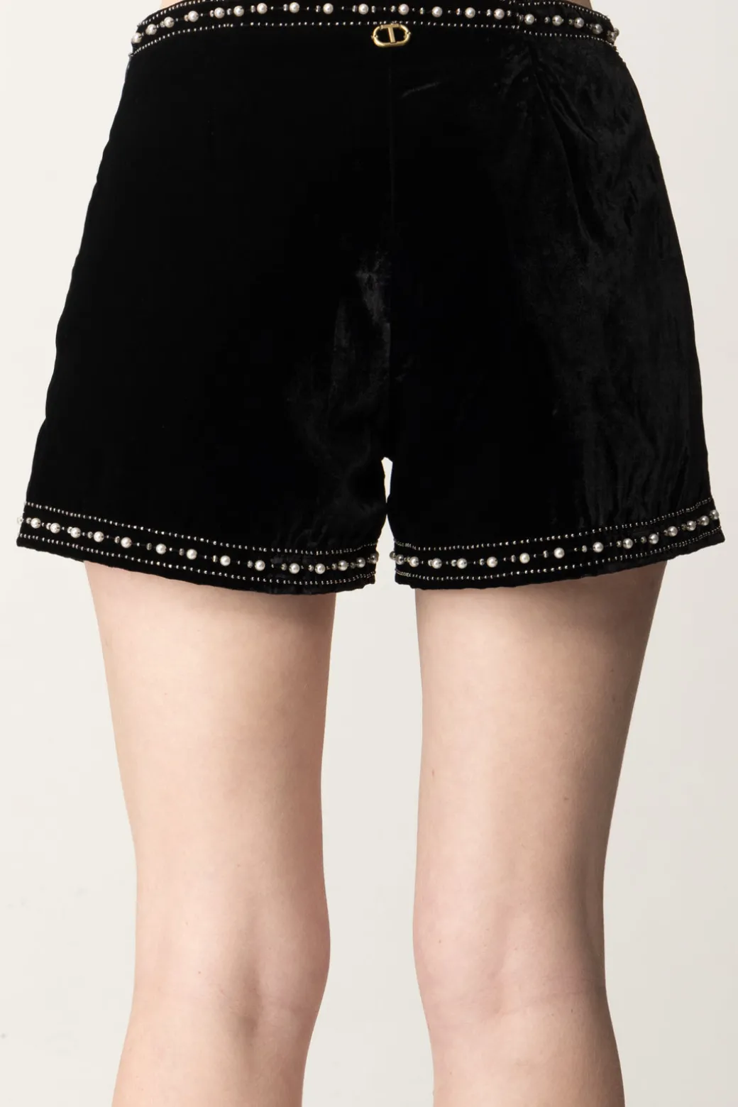 Vedi il luccichio? Viene sicuramente da questi shorts Twinset in velluto nero impreziositi da un motivo geometrico di perle e strass. La vita media e la chiusura laterale con zip nascosta assicurano una vestibilità confortevole e pratica. Ideali per occasioni speciali o serate eleganti, possono essere abbinati a una blusa in seta e tacchi alti per un look sofisticato, ma anche a blazer e crop top per un look glamour e sexy.