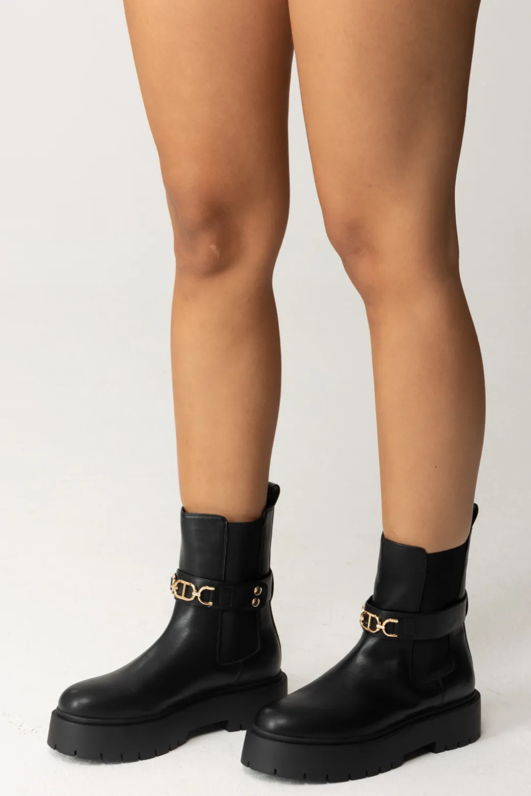 Stivaletti Twinset con fibbia decorativa, suola spessa e un appeal robusto. Perfetti per un look urbano e versatile, da portare con pantaloni cropped o gonne midi per un effetto cool e rilassato.