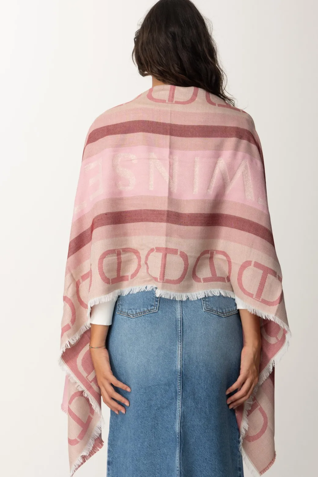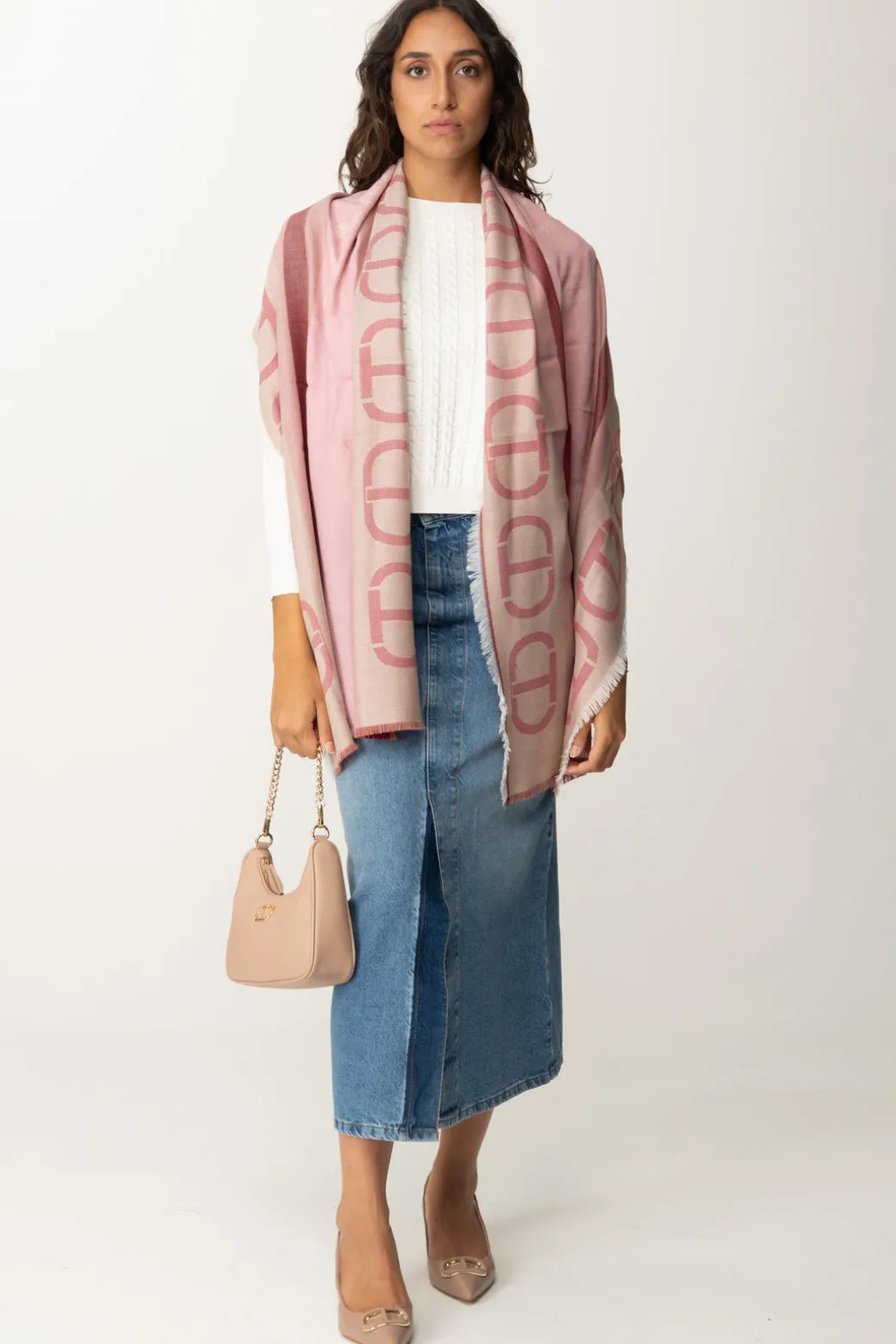 Stola Twinset in maglia jacquard con fantasia Oval T all over, bande a contrasto e fondi sfrangiati. Abbinala a un cappotto neutro e guanti di pelle per un look invernale elegante.