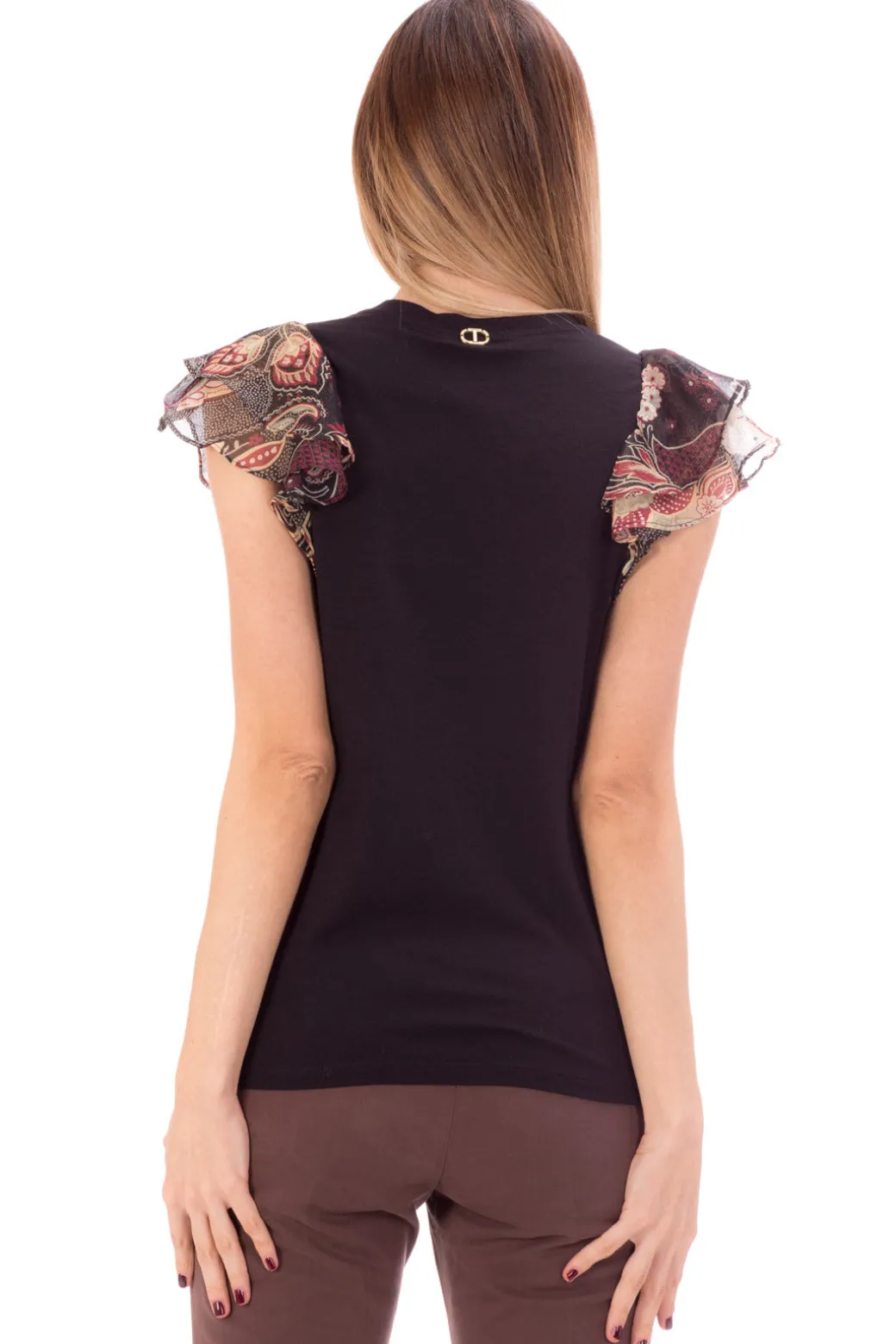 La semplicità di questa t-shirt Twin-set si arricchisce di stile aggiungendo un tocco di rouches dal motivo floreale sulle maniche. Perfetta per donare un tono colorato e stiloso a tutti i tuoi look da giorno!