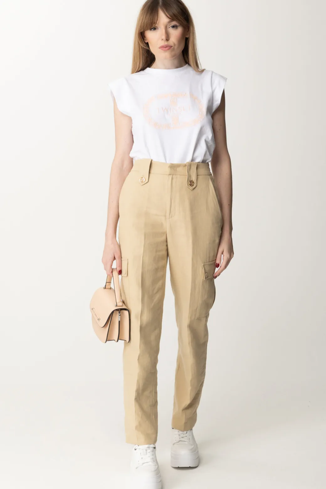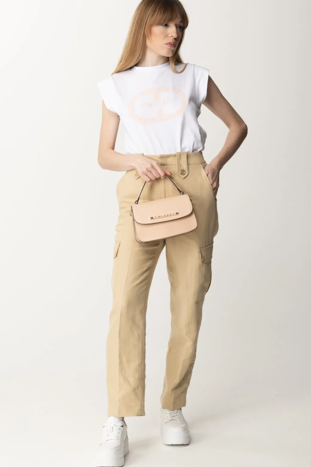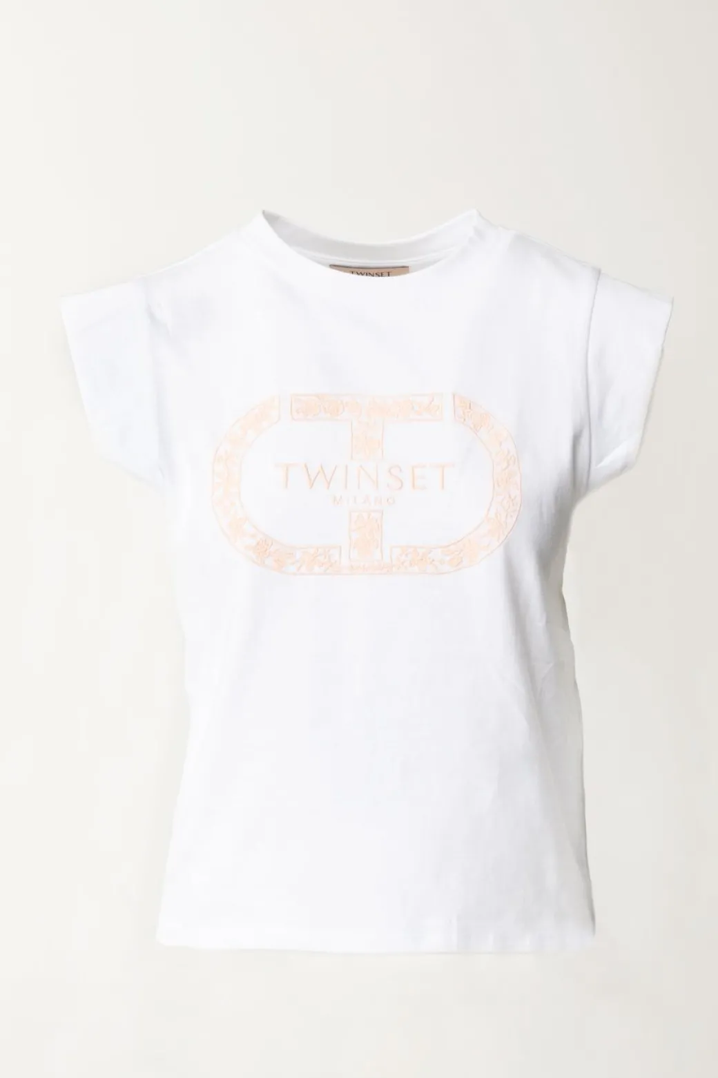 Fresca e versatile T-shirt Twinset che potrai indossare per tutta la bella stagione. Il logo sul petto è una dichiaraizone di stile ed un delicato ornamento al tempo stesso: sfoggialo anche sotto blazer e cardigan creand outfit passe-par-tout giocando con tutte le possibilità di questo capo. Scollo girocollo e maniche ad aletta in stile kimono.