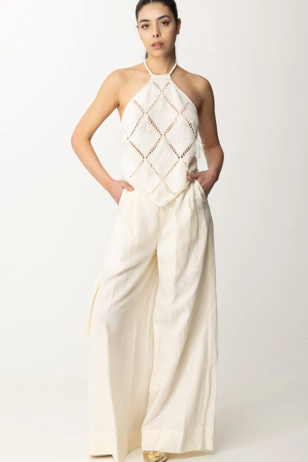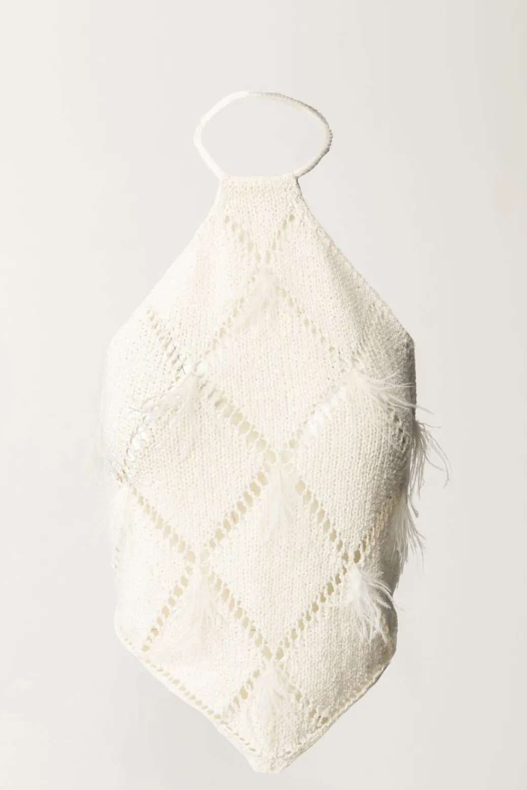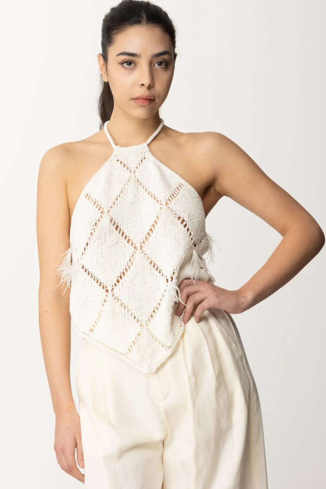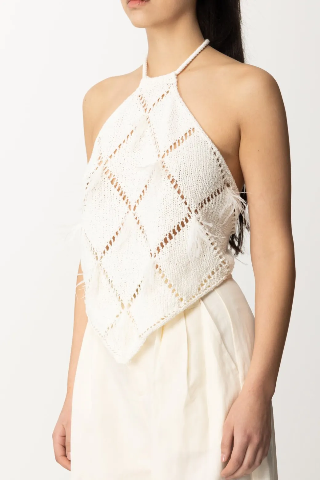 Top a losanghe con piumeTop Twiset realizzato in misto cotone e impreziosito da una lavorazione di trafori a losanghe e il tocco trendy delle piumette ricamate. Il design presenta un collo halter che viene chiuso da un laccio torchon che lascia la schiena completamente scoperta.