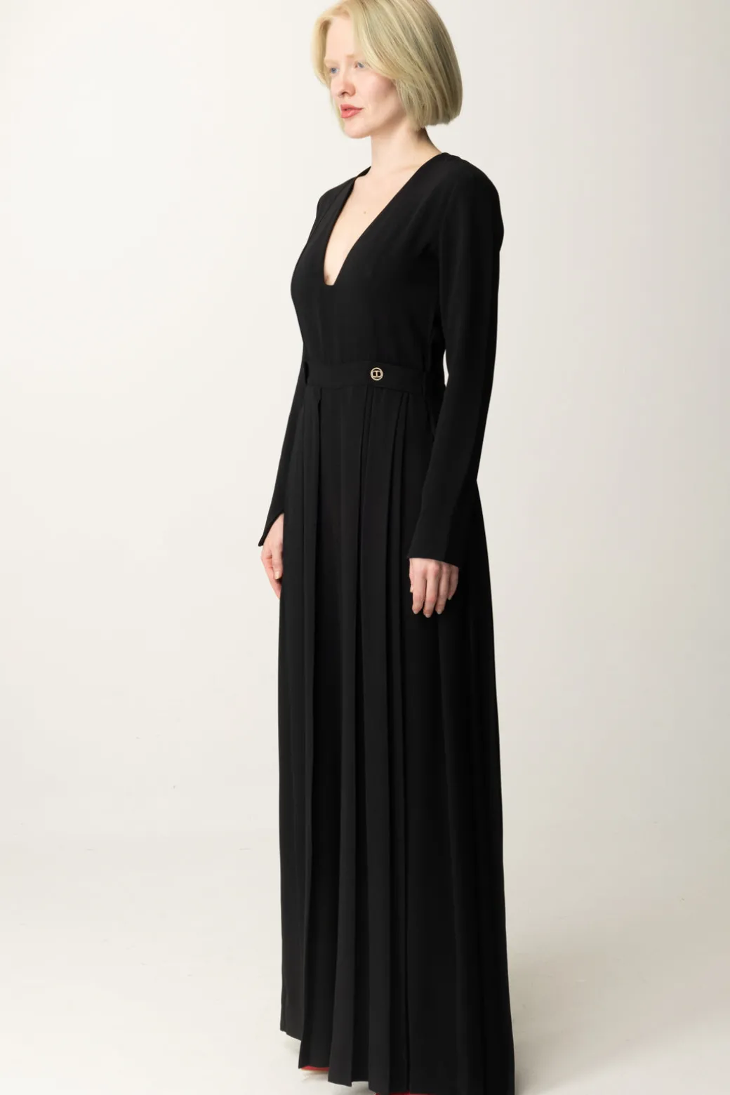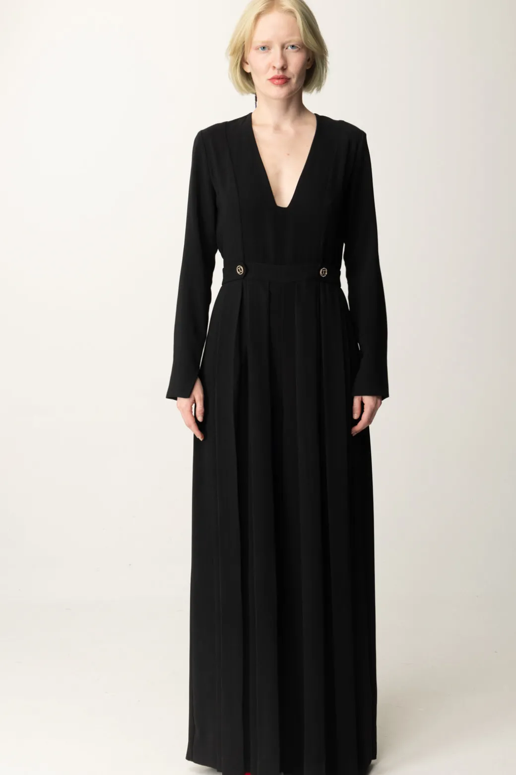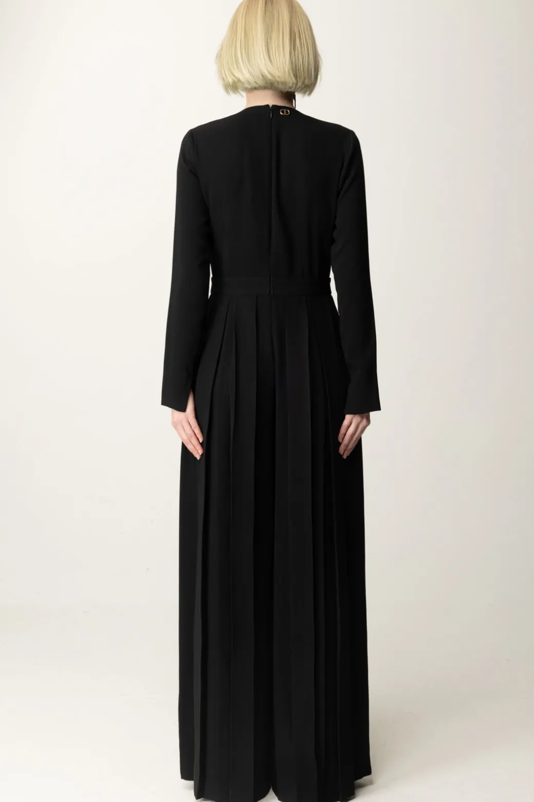 Questa raffinata tuta Twinset è l’ideale per eventi formali e serate speciali. Realizzata in crêpe con pieghe piatte sovrapposte e stirate fino al fondo, presenta un corpetto aderente con tagli verticali e una profonda scollatura a V che valorizza la silhouette. Le maniche lunghe e il taglio in vita con alamari e bottoni gioiello logati Oval T con strass aggiungono un tocco di eleganza. La linea fitted con pantaloni a gamba larga conferisce un aspetto sofisticato e moderno, questa tuta è un must-have per chi desidera un look chic e contemporaneo.